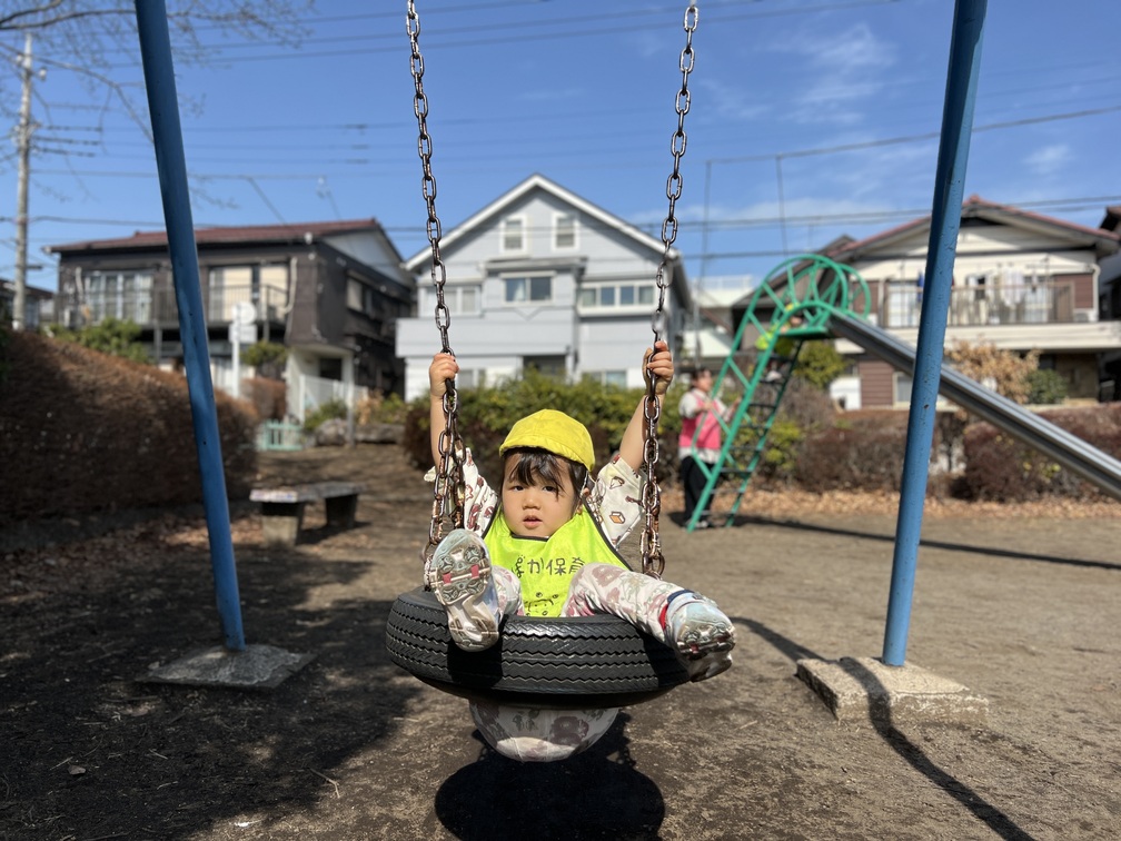 タイヤブランコに自分で乗ってみたところ、お尻がちょうど穴にはまってしまい、ゆらゆら揺れる姿がとっても愛らしかったです。先生たちも思わず笑顔になりました。