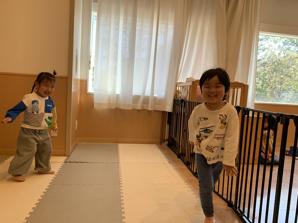 出発前、ほふく室でお友だち同士追いかけっこ。大笑いの声に、見ているこちらもつられてにっこりしてしまいました。体を動かして気持ちのエンジンもばっちり、という感じでしたよ。