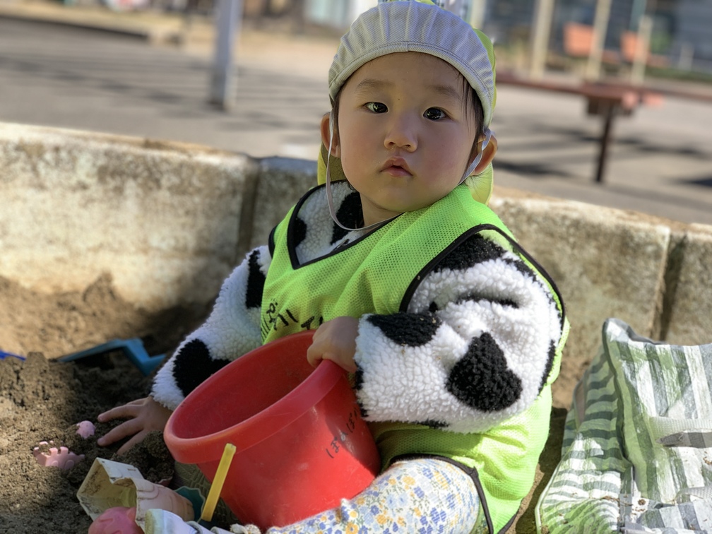 園生活にもすっかり慣れてきて、登園したお友だちを見つけると「赤ちゃんきた!」と可愛い声で知らせてくれます。午睡前にも「赤ちゃんねんね」と指さして教えてくれるなど、周りをよく見ている様子が伝わってきます。