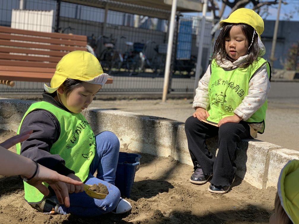 公園へは先生と手をつないで、行きも帰りもしっかり歩けました。お砂場ではアイス作りに夢中。先生たちにたくさんふるまって、ニコニコの表情でした。