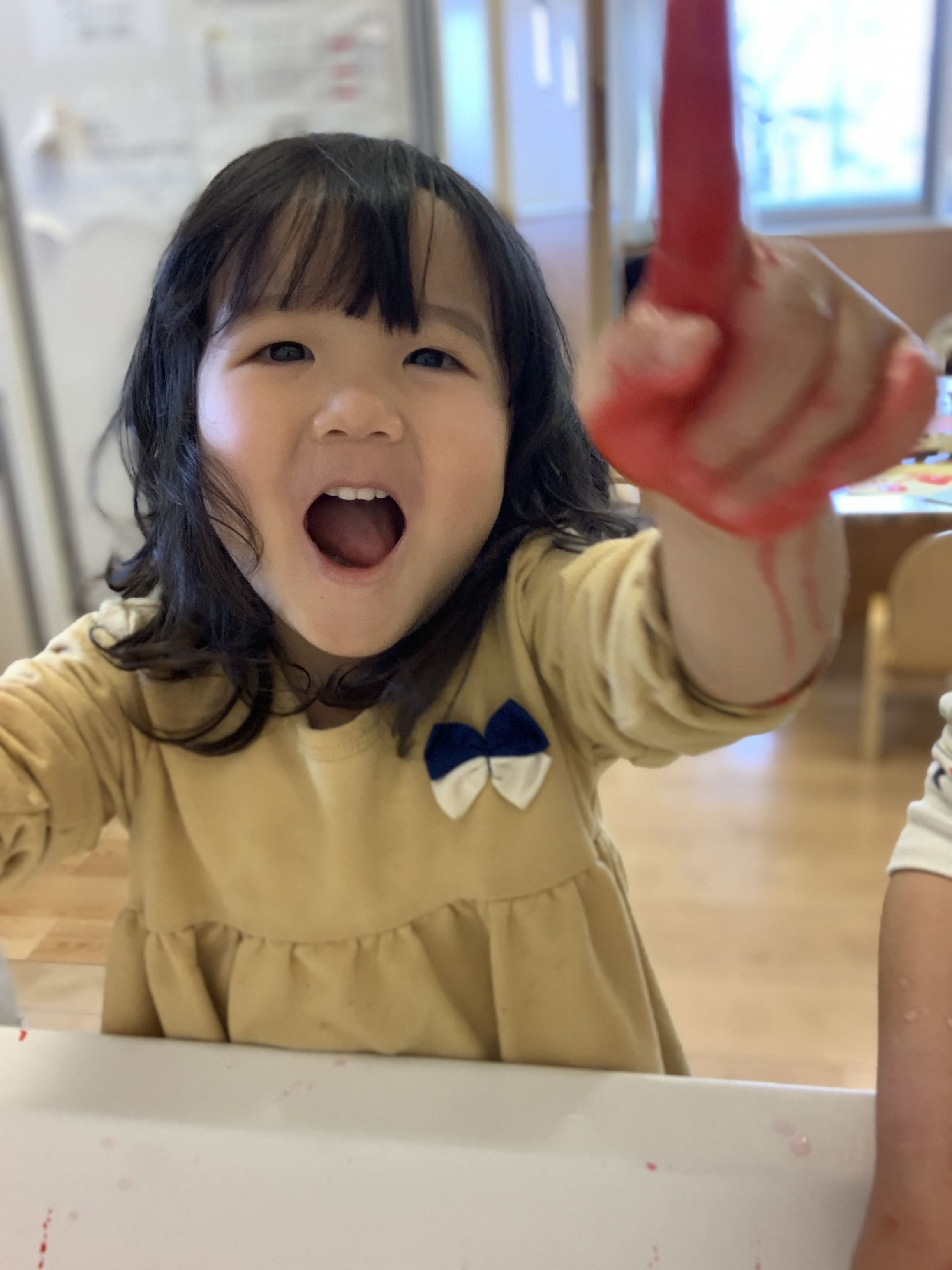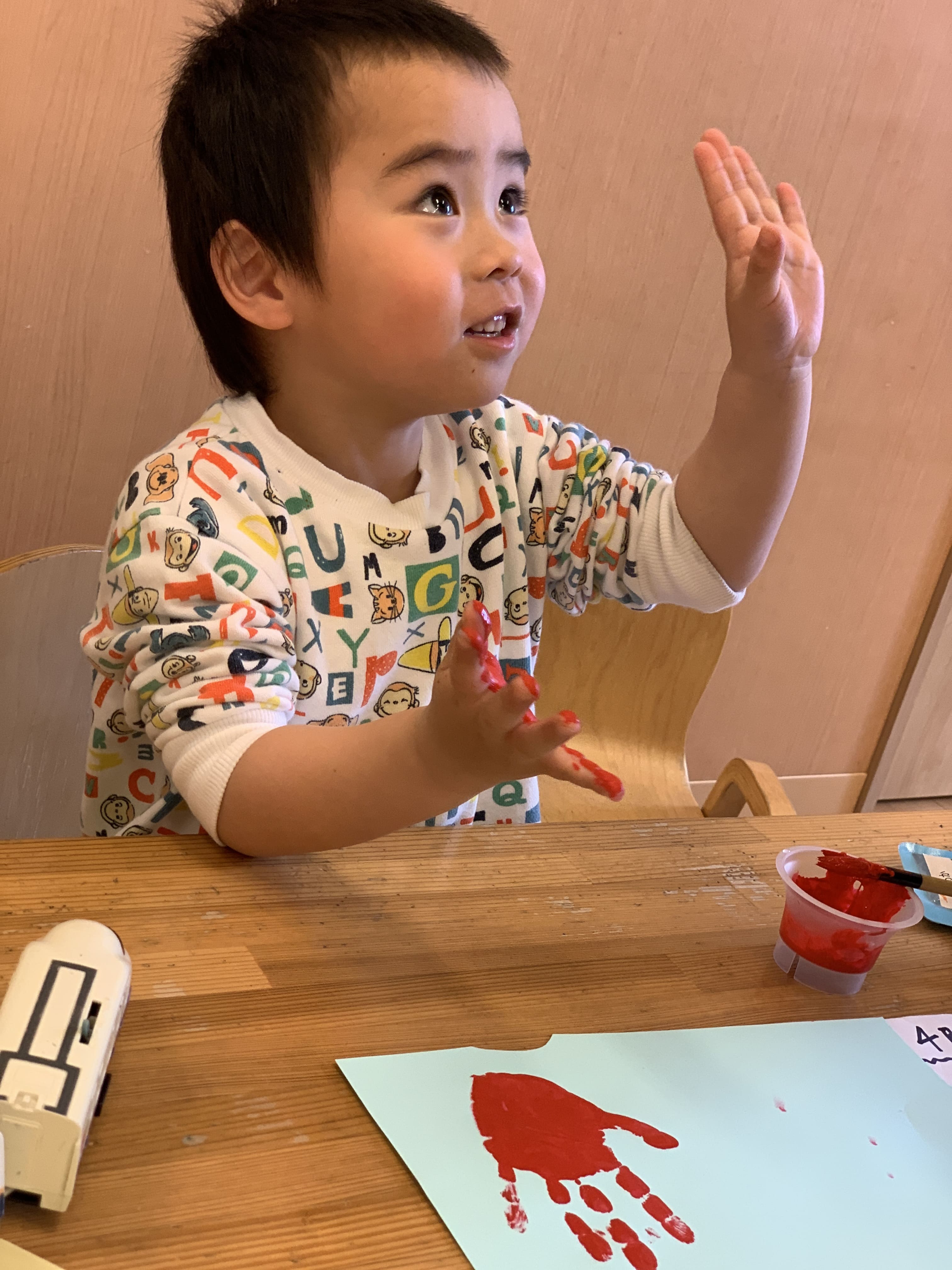 「ぺたーん」と、絵の具をつけた手を紙に押し付けると、