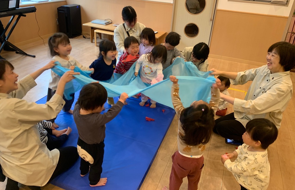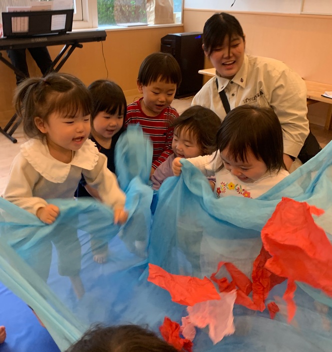大判スカーフに、花紙のお花と花びらを沢山のせて、園歌に合わせて揺らします。