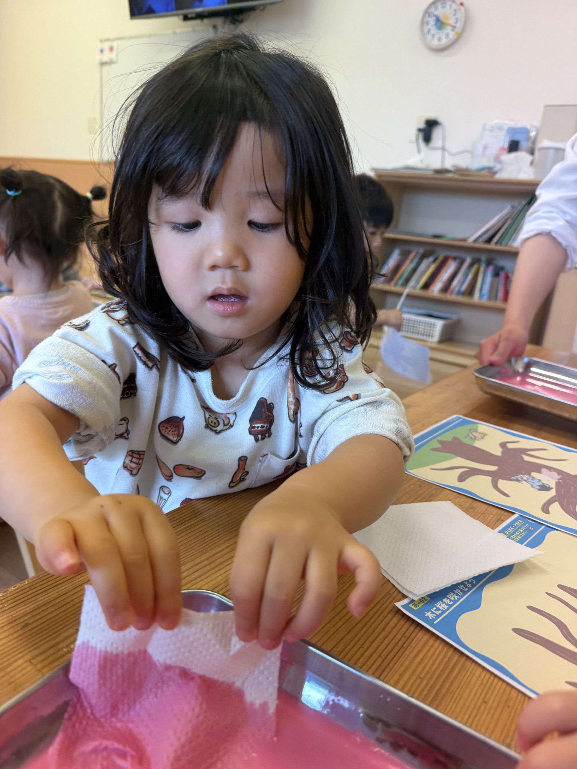 まずは、ピンク色の色水を用意して、色々な素材の紙を染めていきます。