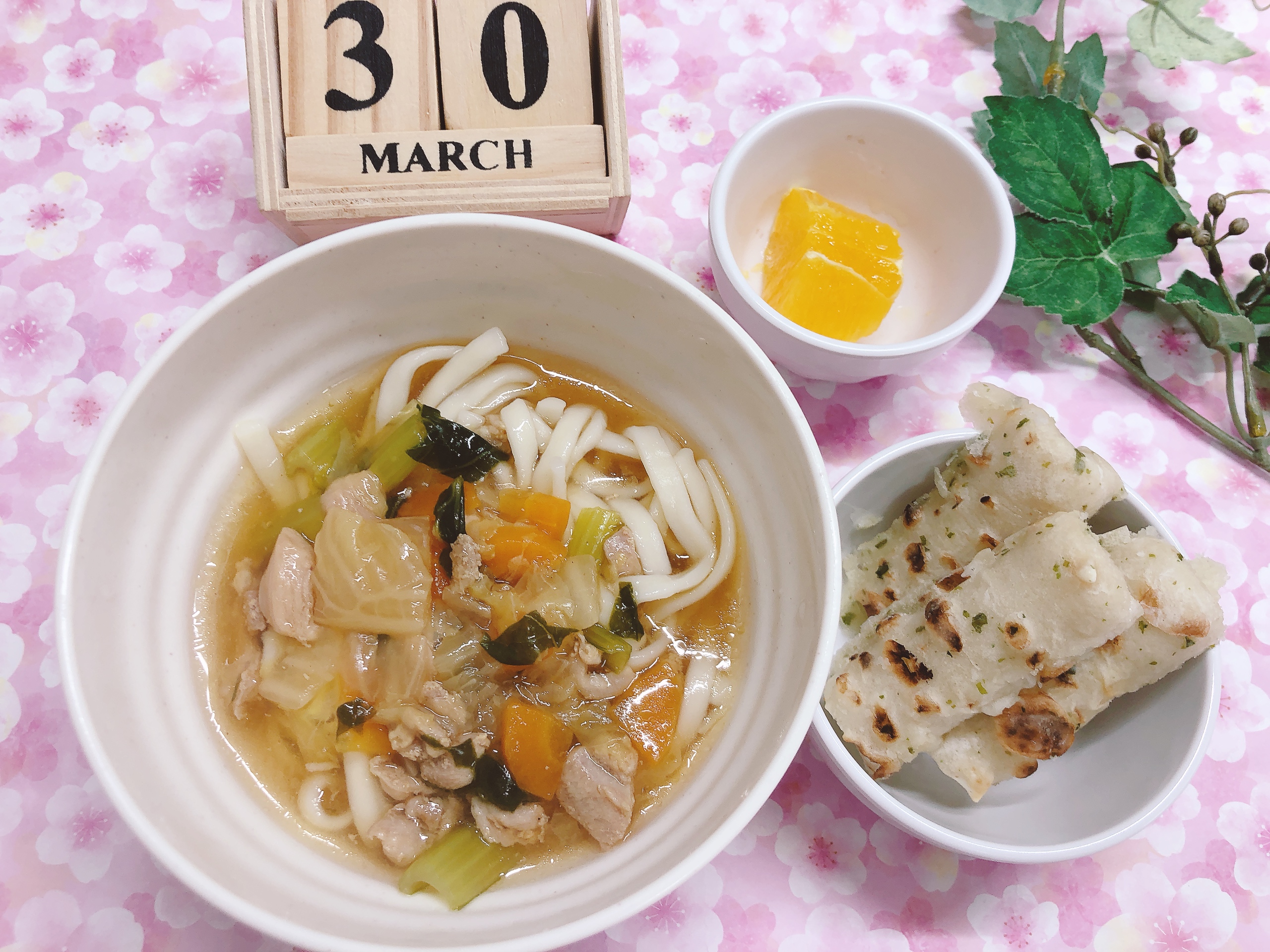こんにちは、ぽかぽか保育園給食室です。八王子市・日野市で小規模・幼児教育特化の保育園として365日開所し、休日保育・病児保育・一時保育にも対応。習い事プログラムや手厚い保育で“選ばれる園”をめざし、保活中のママ・パパの育児をサポートしています。YouTube保育園チャンネルでは給食の調理シーンや食育のポイントを発信中!それでは3月30日(月)のメニューをご紹介します。