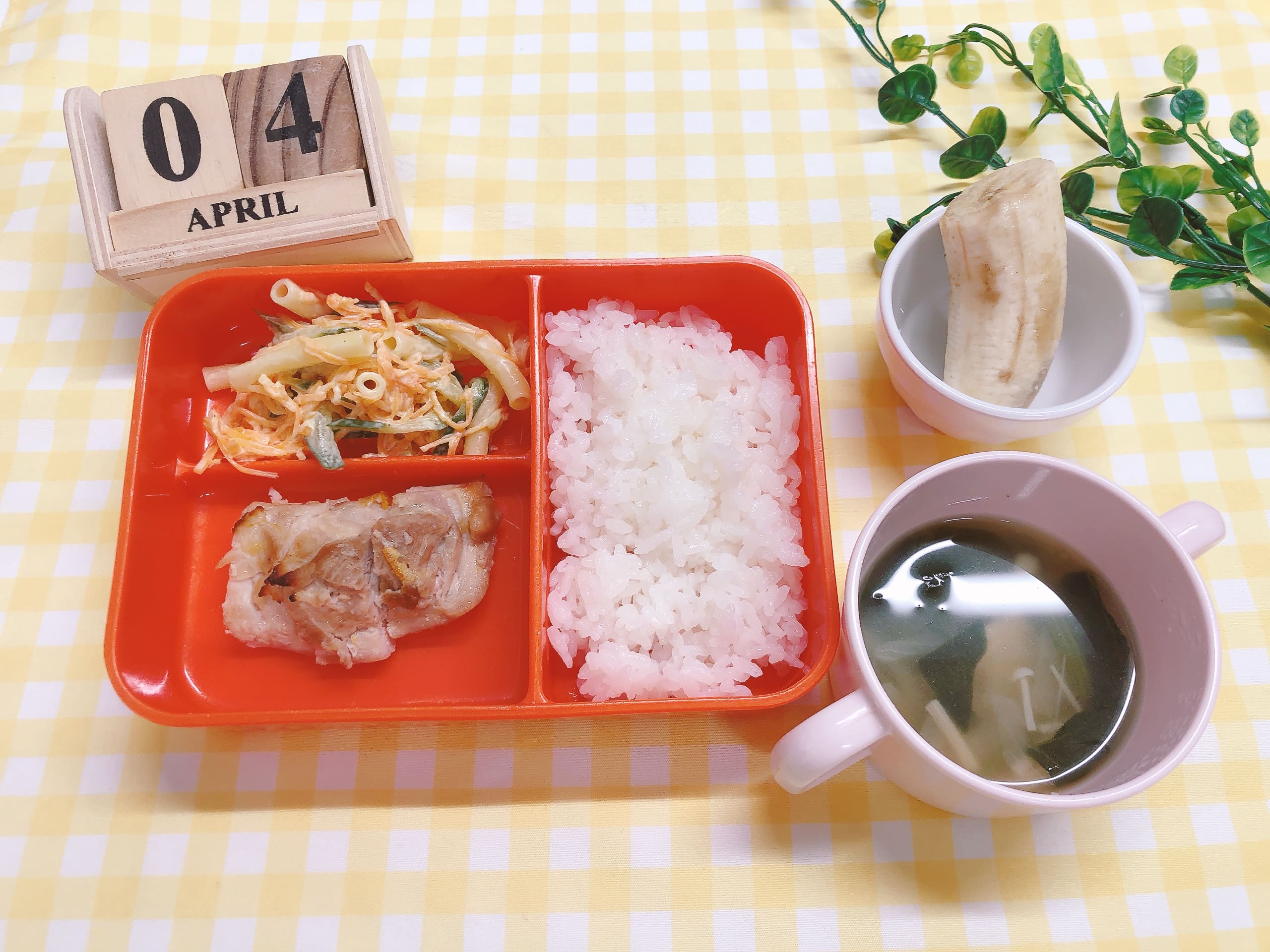 こんにちは、ぽかぽか保育園給食室です。八王子市・日野市の小規模・幼児教育特化の保育園として365日開所し、休日保育・病児保育・一時保育にも対応しています。習い事プログラムや手厚い保育で“選ばれる園”をめざし、保活中のママ・パパの育児をしっかりサポート。YouTube保育園チャンネルでは給食調理の様子や食育動画を配信中です。それでは4月4日(土)のメニューをご紹介します。