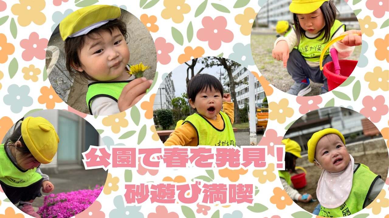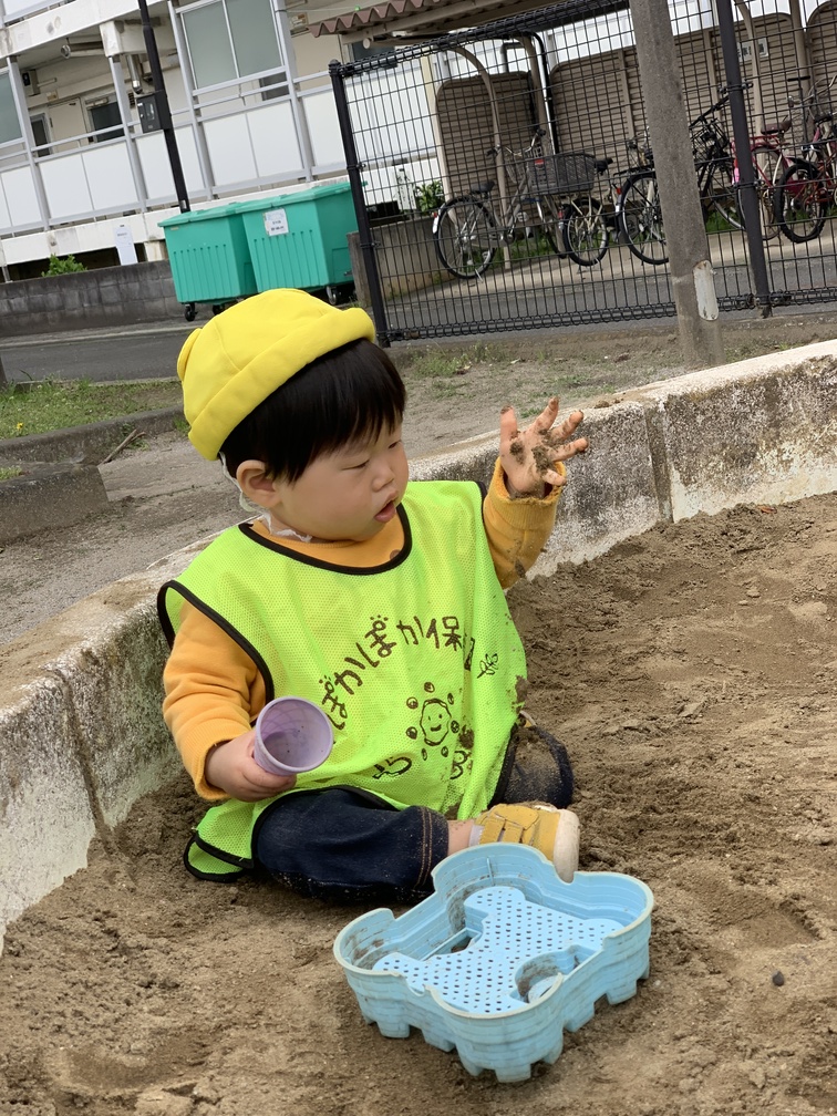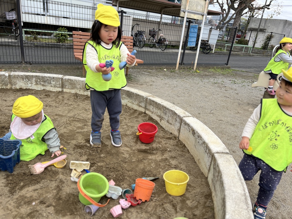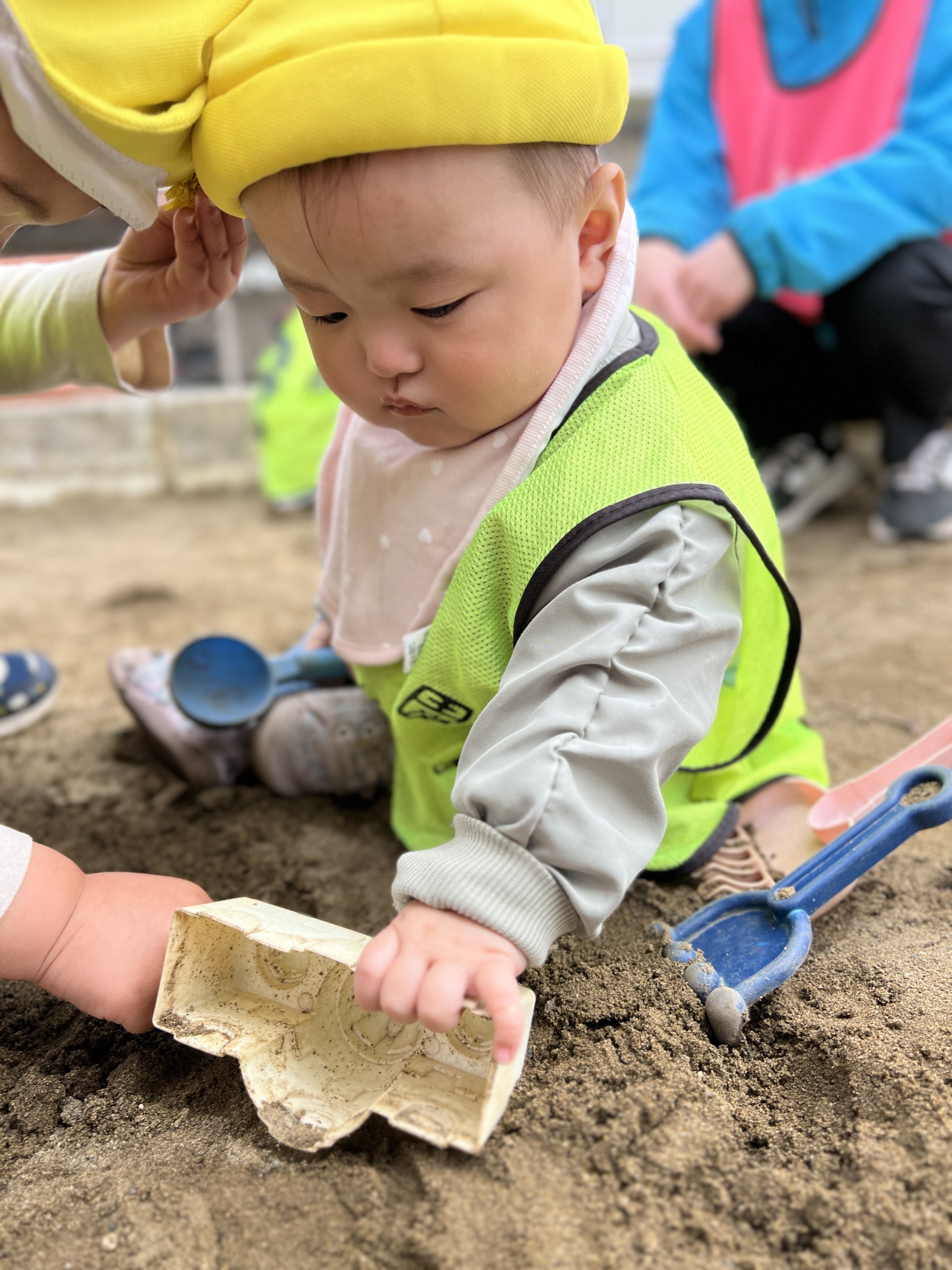 砂場では、0歳児クラスのお友だちが砂場遊びのおもちゃに、興味津々でした。