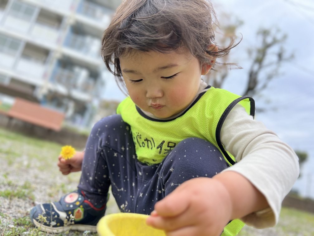 また別の子は地面をそっと覗き込んで、「せんせい!アリさん!」と発見したのは2歳児クラスのお兄さん。