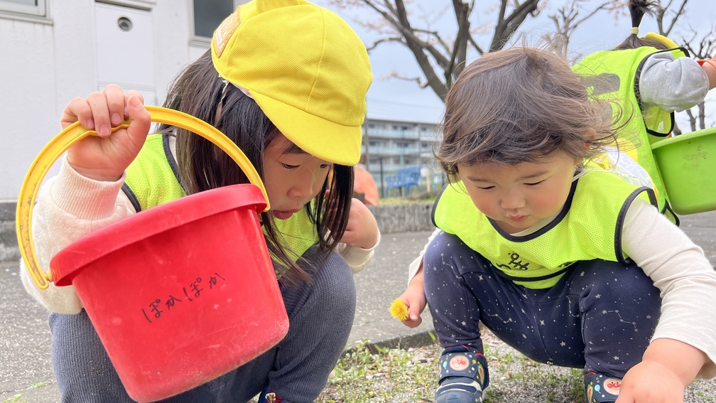 すると、横にいた2歳児クラスのお姉さんも「見せてー!」と寄ってきて一緒にバケツの中を覗き込み、