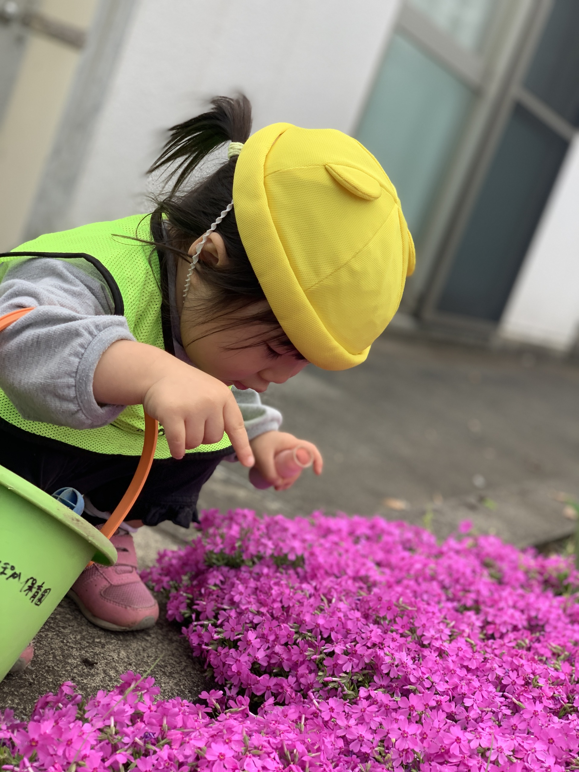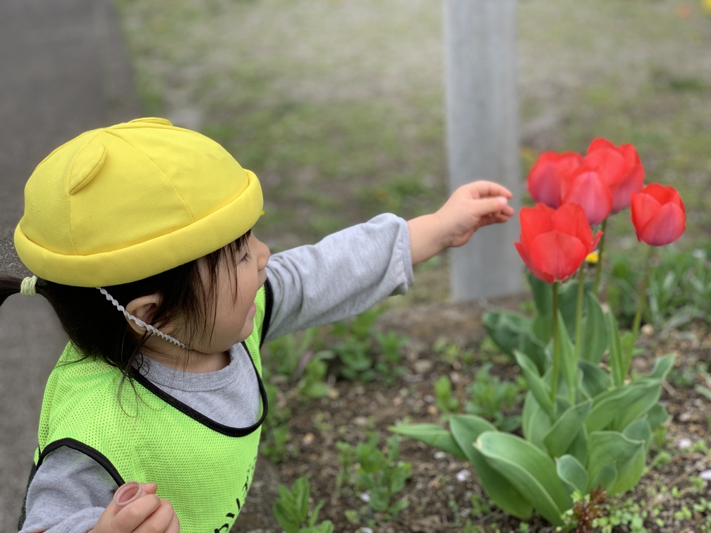 2歳児クラスのお姉さんが、きれいなチューリップを見つけ「お花、きれいだね」と近づいたとき、先生が優しく、「触るだけだよ、優しくね」と伝えると、お姉さんは、そっと指先で花びらに触れて感触を確かめていました。