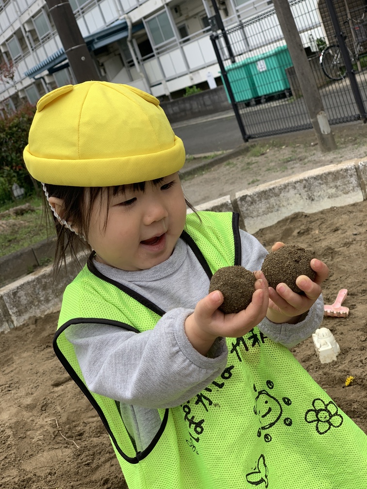 先生が作った、つるつるの砂団子を「どうぞ」と差し出すと、子どもは「わぁ!」と目を輝かせ、両手でそっと受け取って嬉しそうに抱えていました。その笑顔はまるで宝物を見つけたかのようでしたよ。