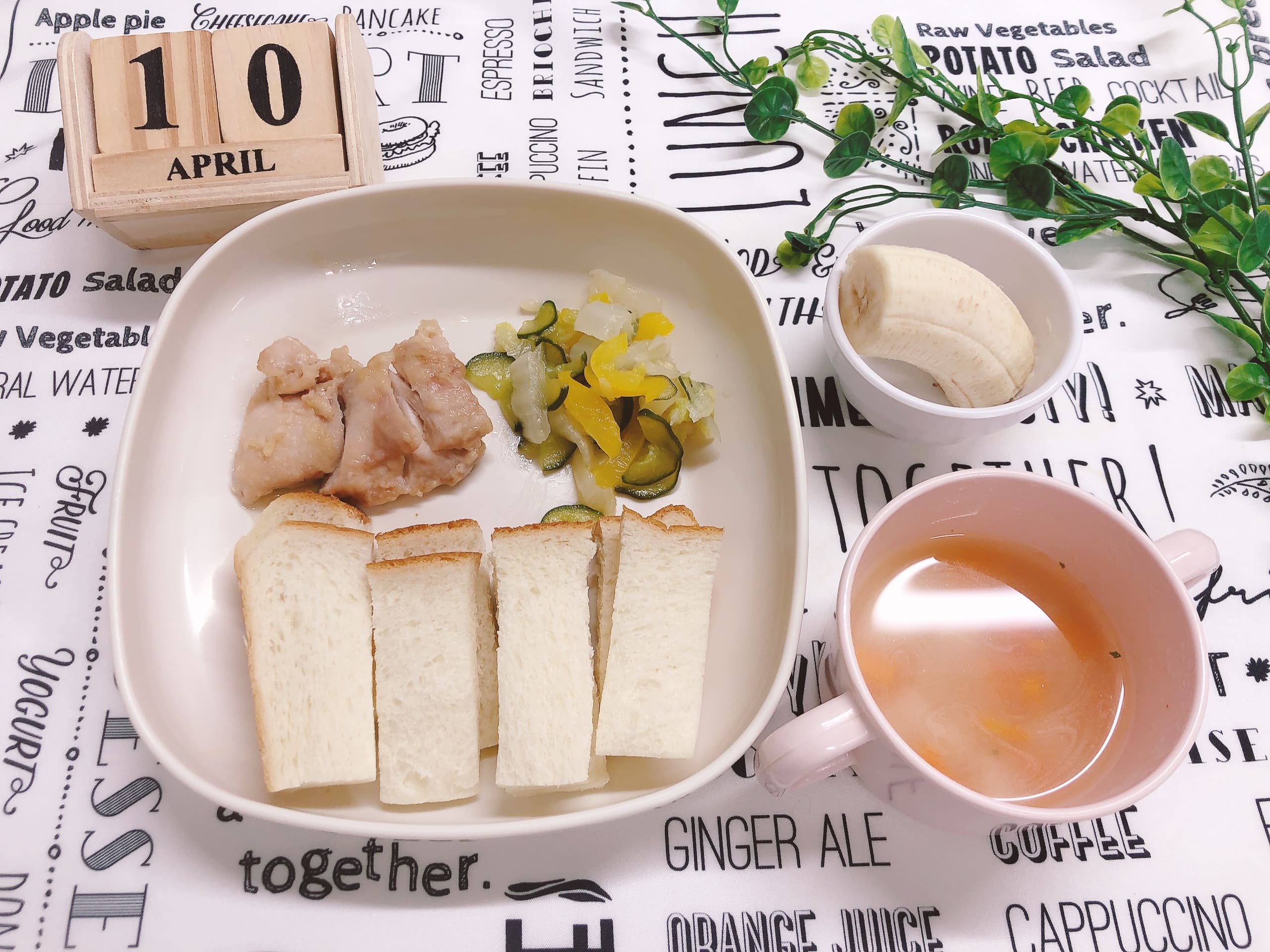 「パンふわふわ!」と食パンに手が止まらず、おかわり続出。チキンソテーも「おにくおいしい!」とパクパク。フレンチサラダは「シャキシャキする!」と興味津々に食べ、「あったかいね」とにっこり。バナナまでしっかり完食し、午後の活動に向けて元気いっぱいでした。