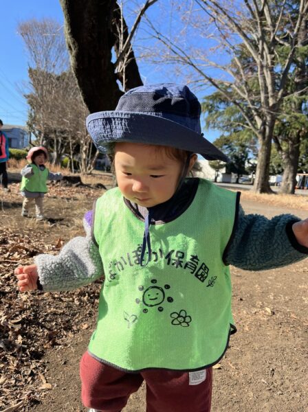 その頃0・1歳児は公園へお散歩に行っていました!園を出るとき、先生が「今日も落ち葉がいっぱいだね!」と話すと、子どもたちは足もとを見つめながらゆっくりと進み、落ち葉を見つけると踏んづけてパリッといい音を鳴らしながら公園に向かいました!