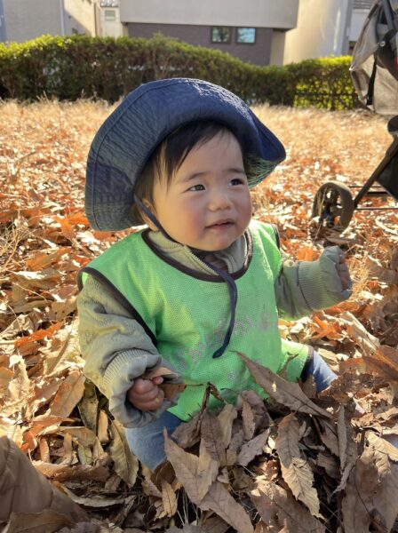 公園では0歳児は落ち葉の山に手を入れて、指先でカサカサの音を確かめるように握っては離し。先生が「ふわっとお空へ~」と誘うと、子どもたちは葉を上へ放り、ひらひら舞い落ちる様子に「わぁ」と声を上げて喜んでいました♡