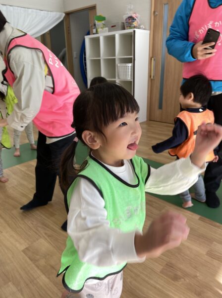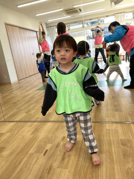 しかし、音楽が変わって好きな曲が流れると、「これ好き!!」と笑顔がはじけ、「先生、見てて!」と伝えながらリズムに合わせて大きなステップと手振りで参加することができました!