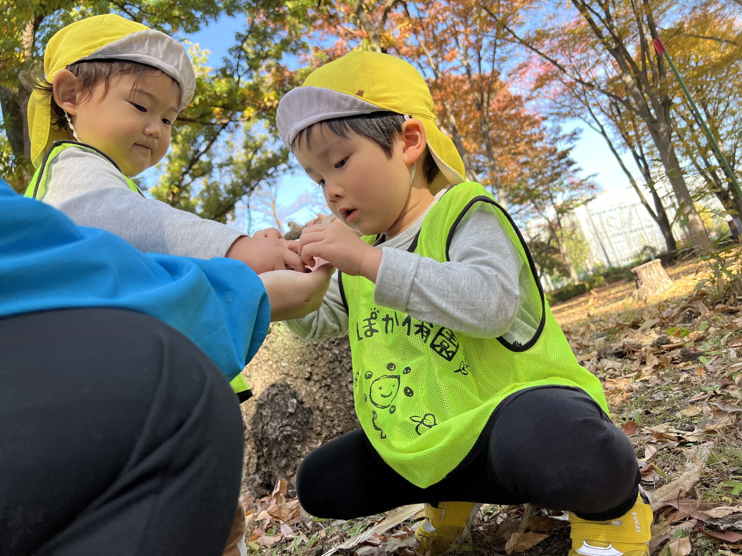 今日の公園遊びは、秋の自然を全身で感じながら、子どもたちが元気いっぱいに遊び、お友だちと仲良しの時間を過ごし、たくさんの笑顔が咲き誇る一日となりました。