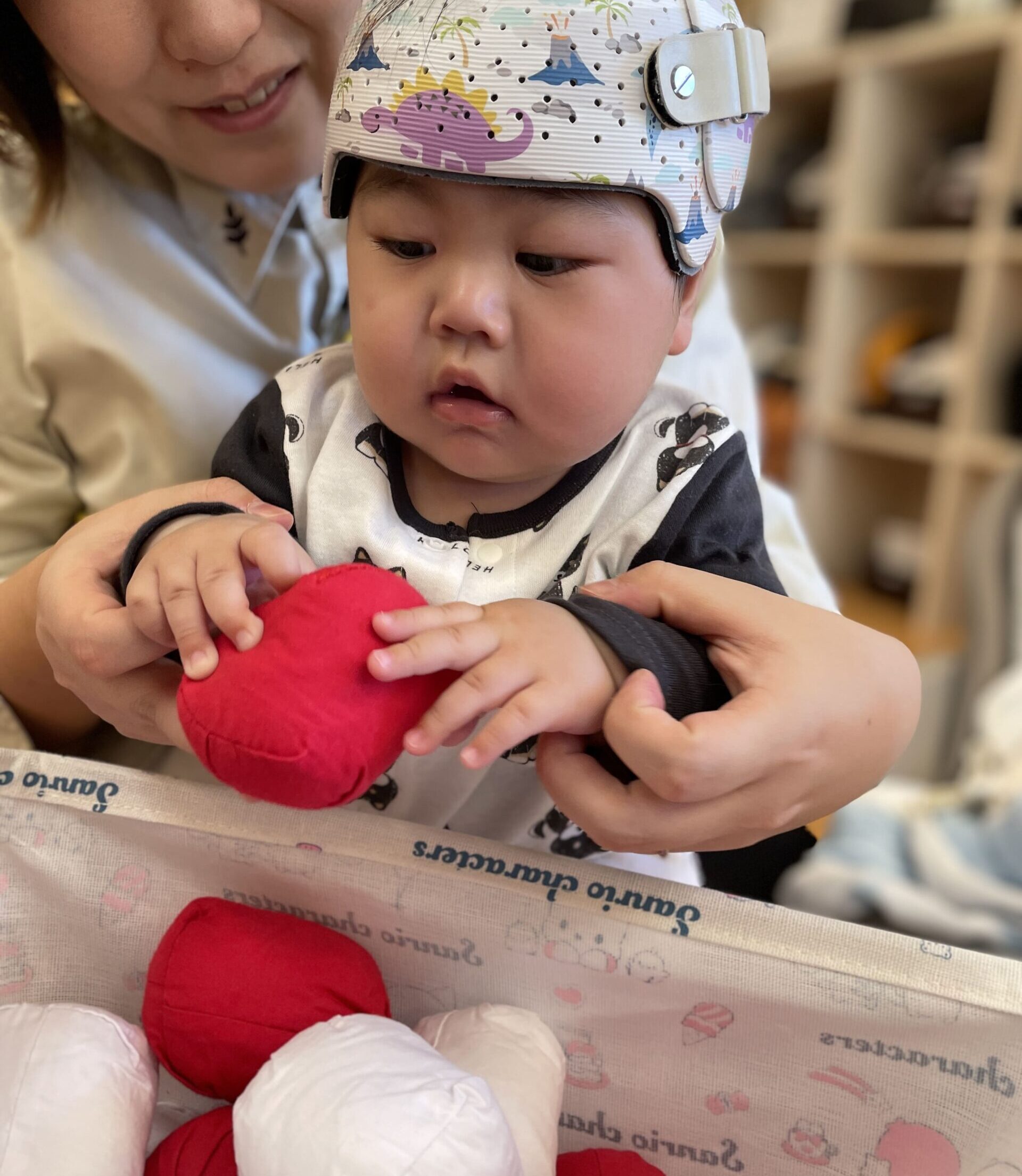 紅白の玉をかごに入れる遊びだは0歳児も挑戦!先生の「ぎゅっと握って…ポイッ!」の声に合わせてお手玉をぎゅっと握りしめ、見事にかごへ。周りの子どもたちから「すご~い!」「できたね♡」と拍手が起き、先生も「できたね、すごい!」と一緒に喜びました