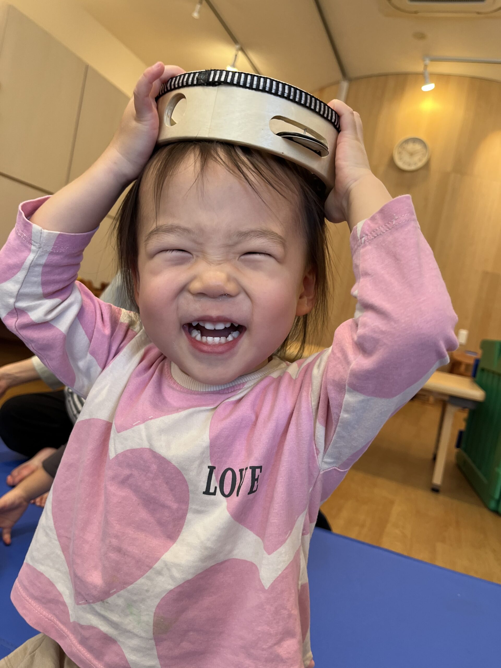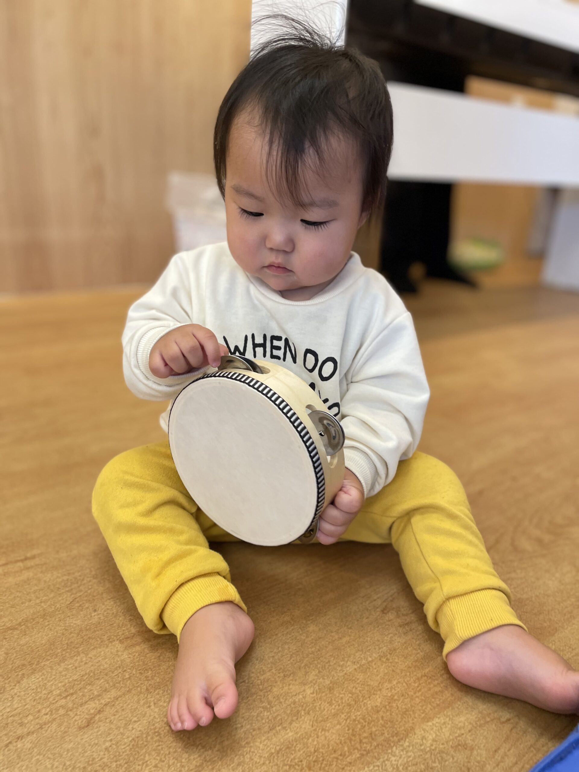 先生が「タンバリン、叩いてみる?」と声をかけると、「うん!」と小さな手が伸び、タン!タン!と元気な音がたくさん聴こえてきます♬