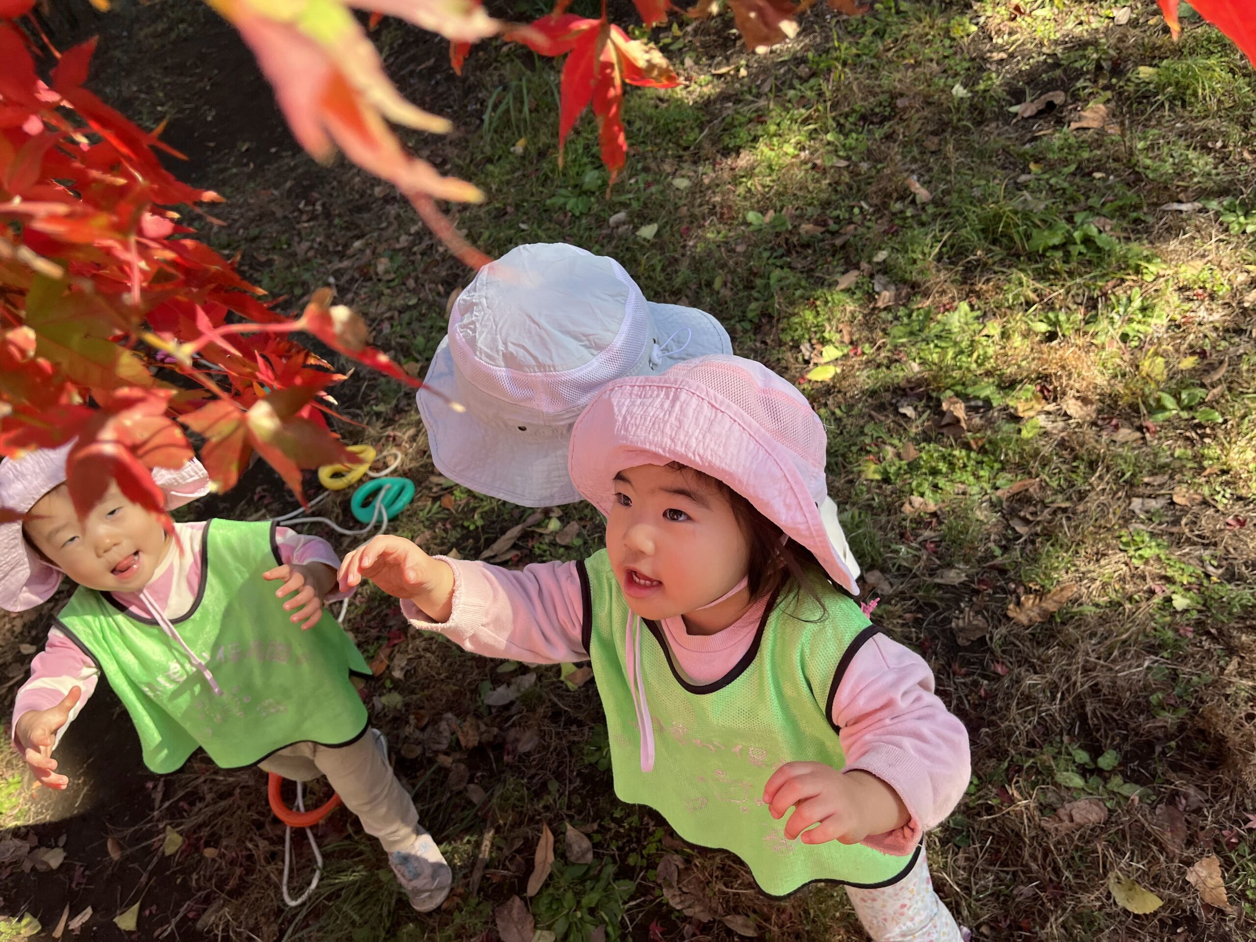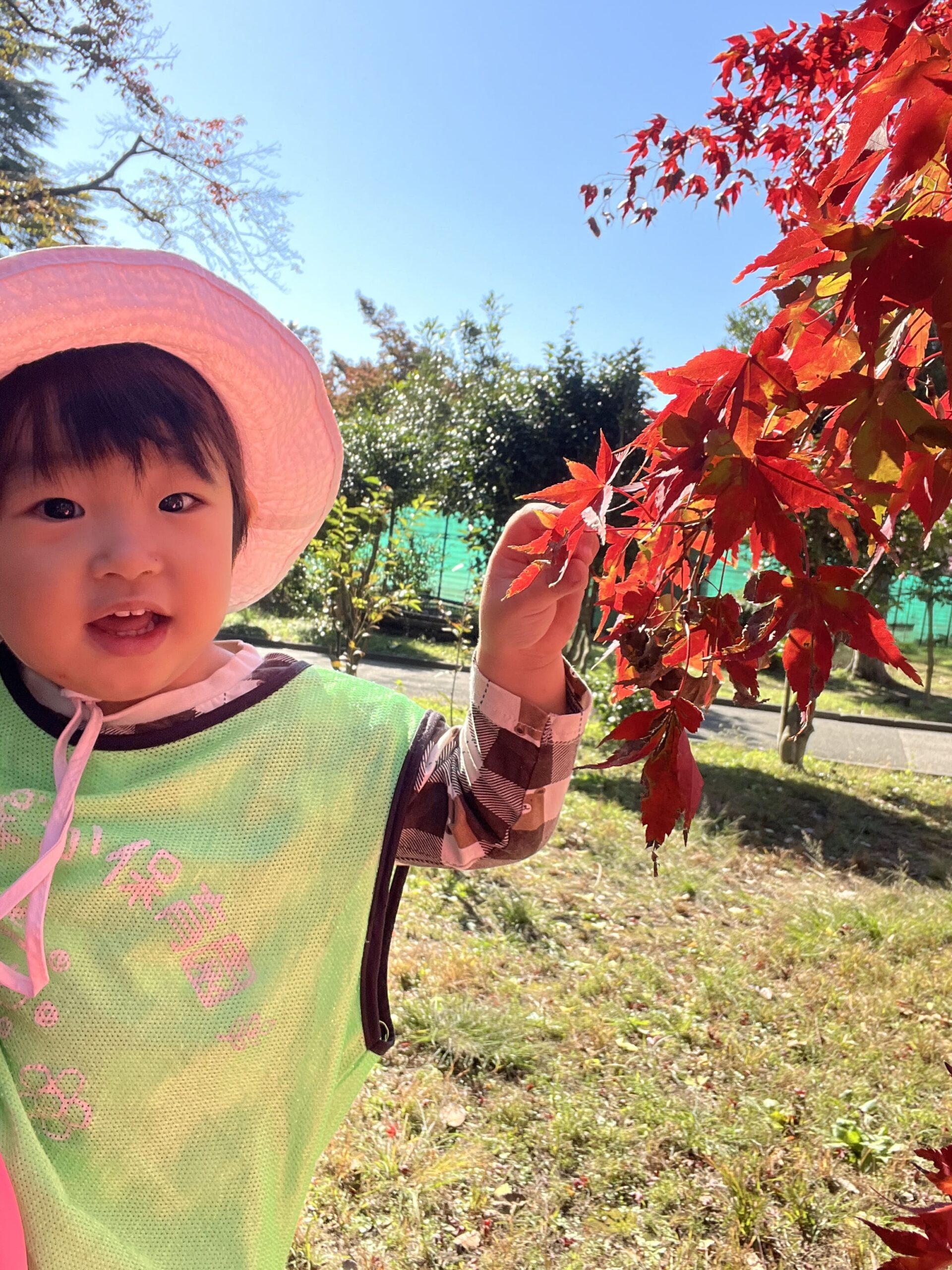 帰り道、公園内のもみじが綺麗に紅葉しているのを見つけ、みんなで近づいて観察しました。先生が枝をそっと持って子どもたちの近くに運ぶと、ジャンプしながら触ろうとする姿がなんとも可愛らしく、思わず「もうちょっとで届くよ!」と応援♡