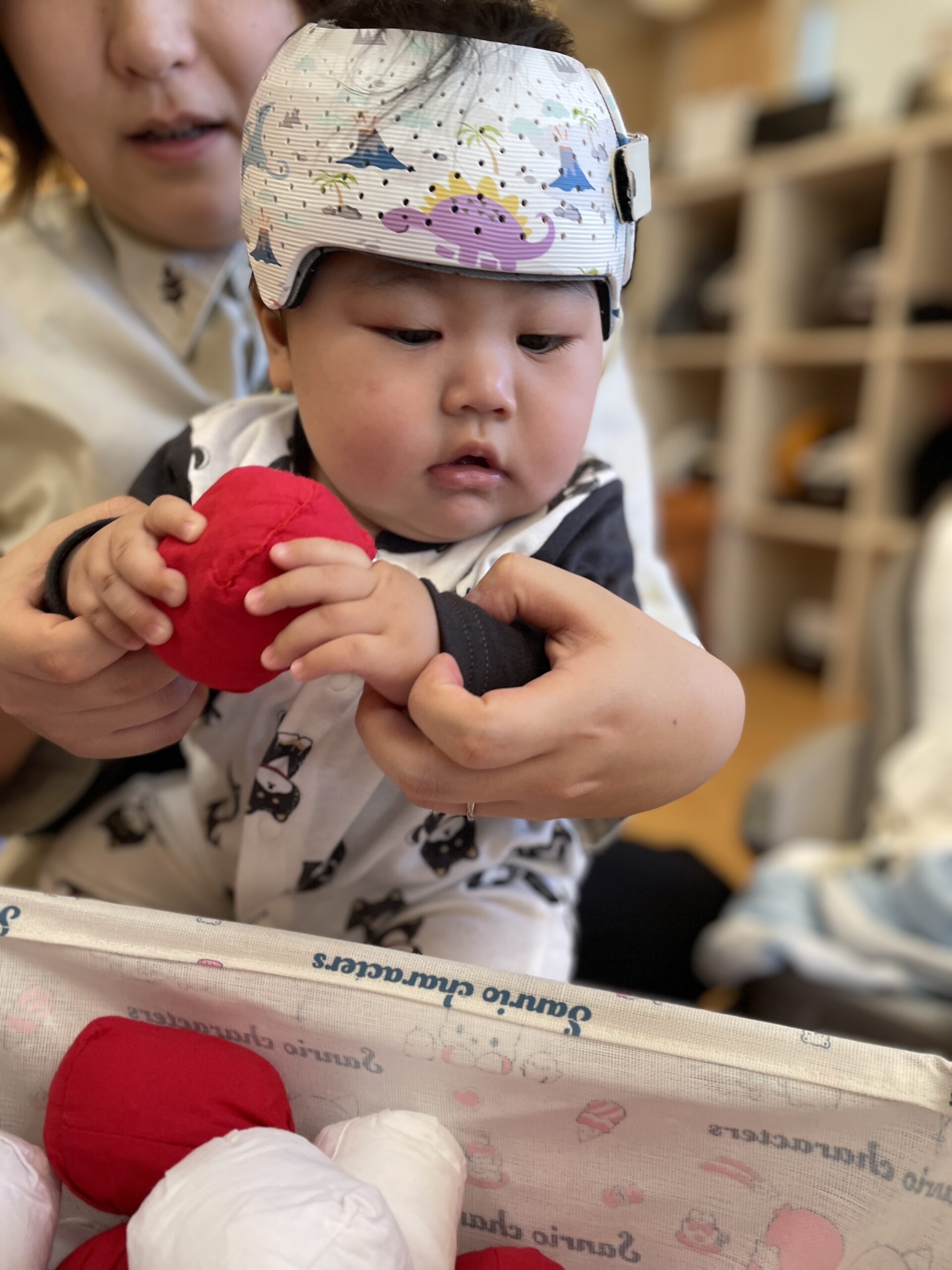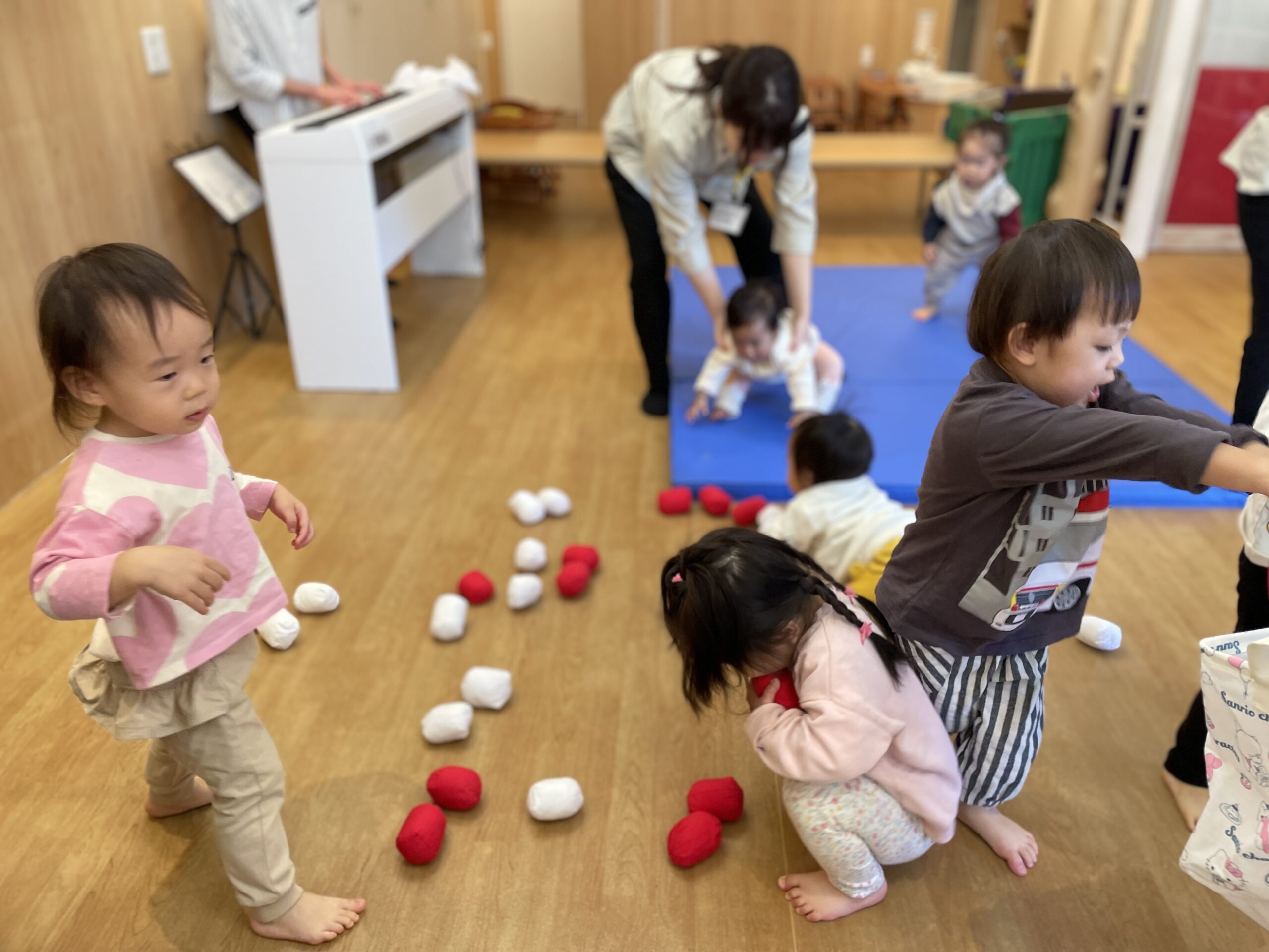ピアノが鳴ったらみんなで玉をカゴに入れて、ピアノが止まったらみんなもストップします♪