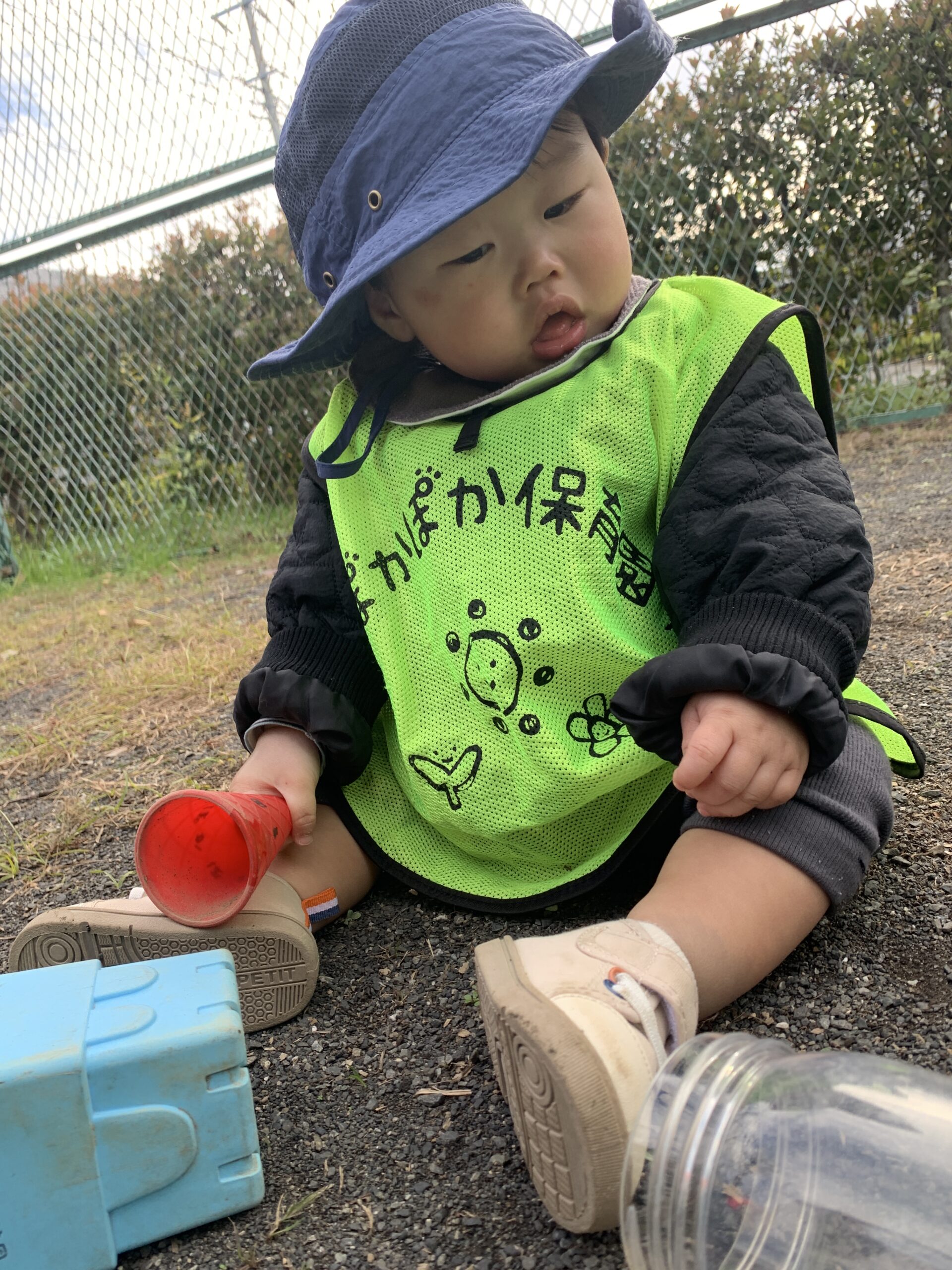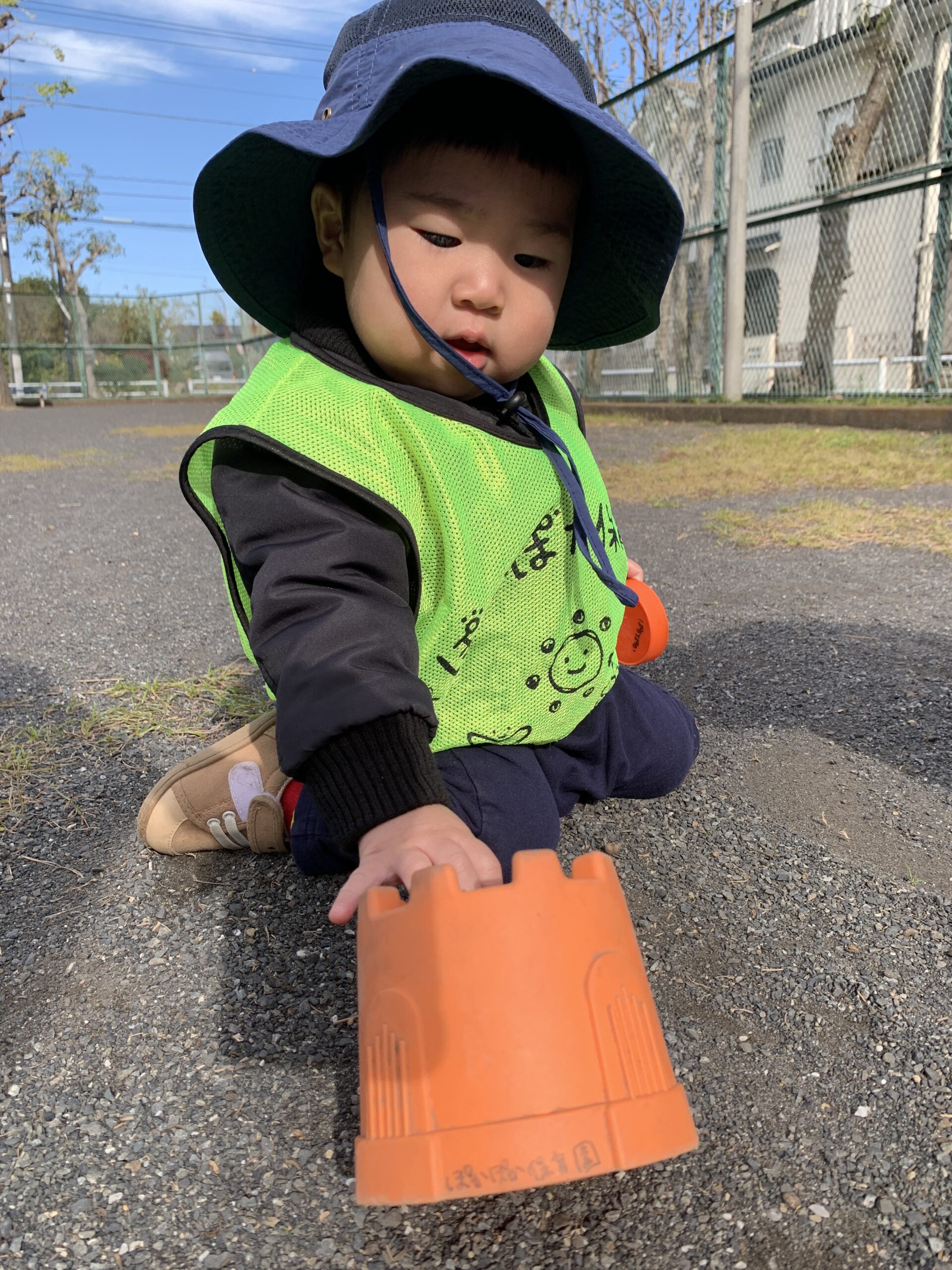 また、先生がバケツやカップなどの玩具を積み重ねてみると