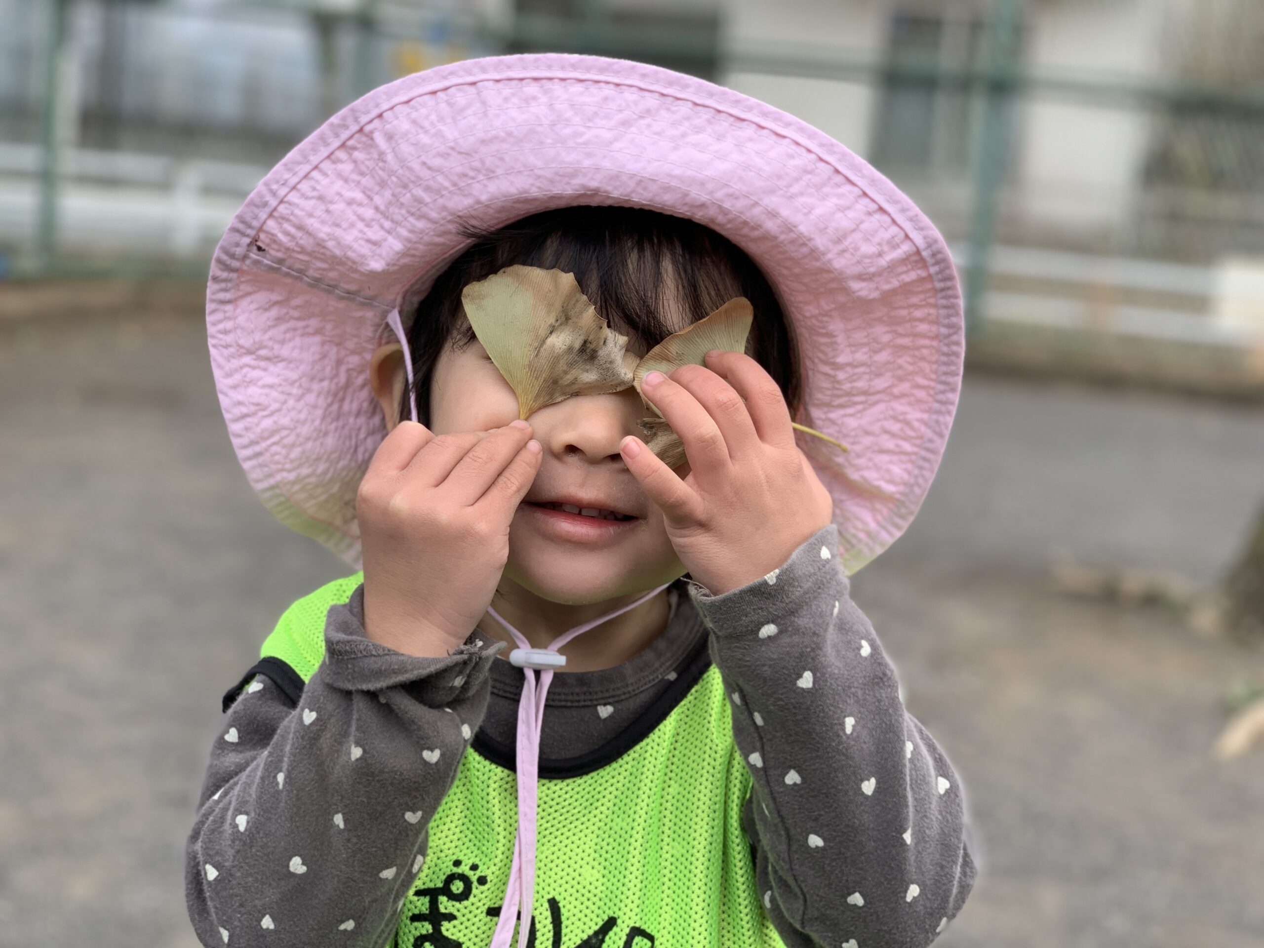 落ち葉を拾って顔を隠してみたり、ベンチを使ってお店屋さんをして