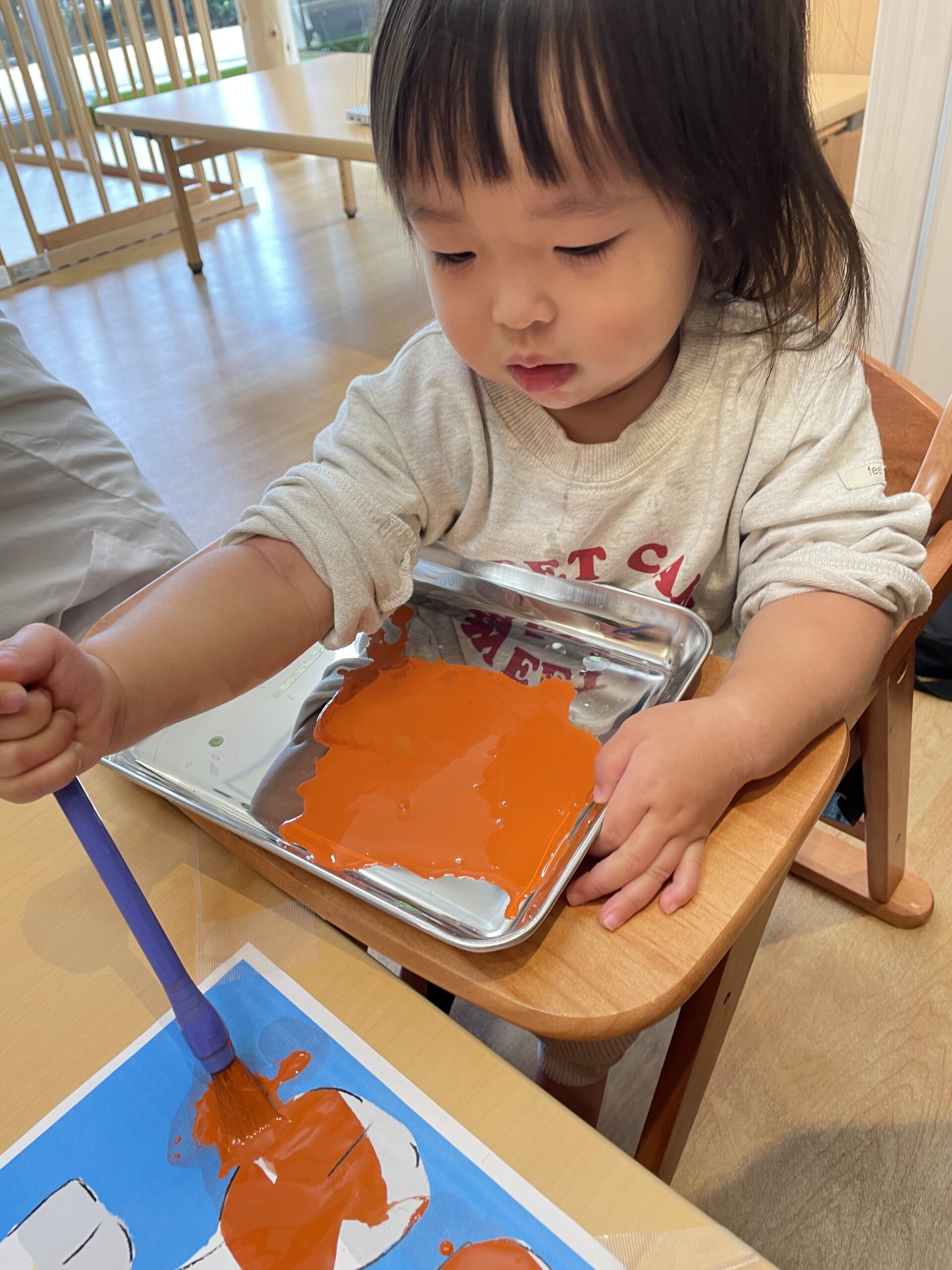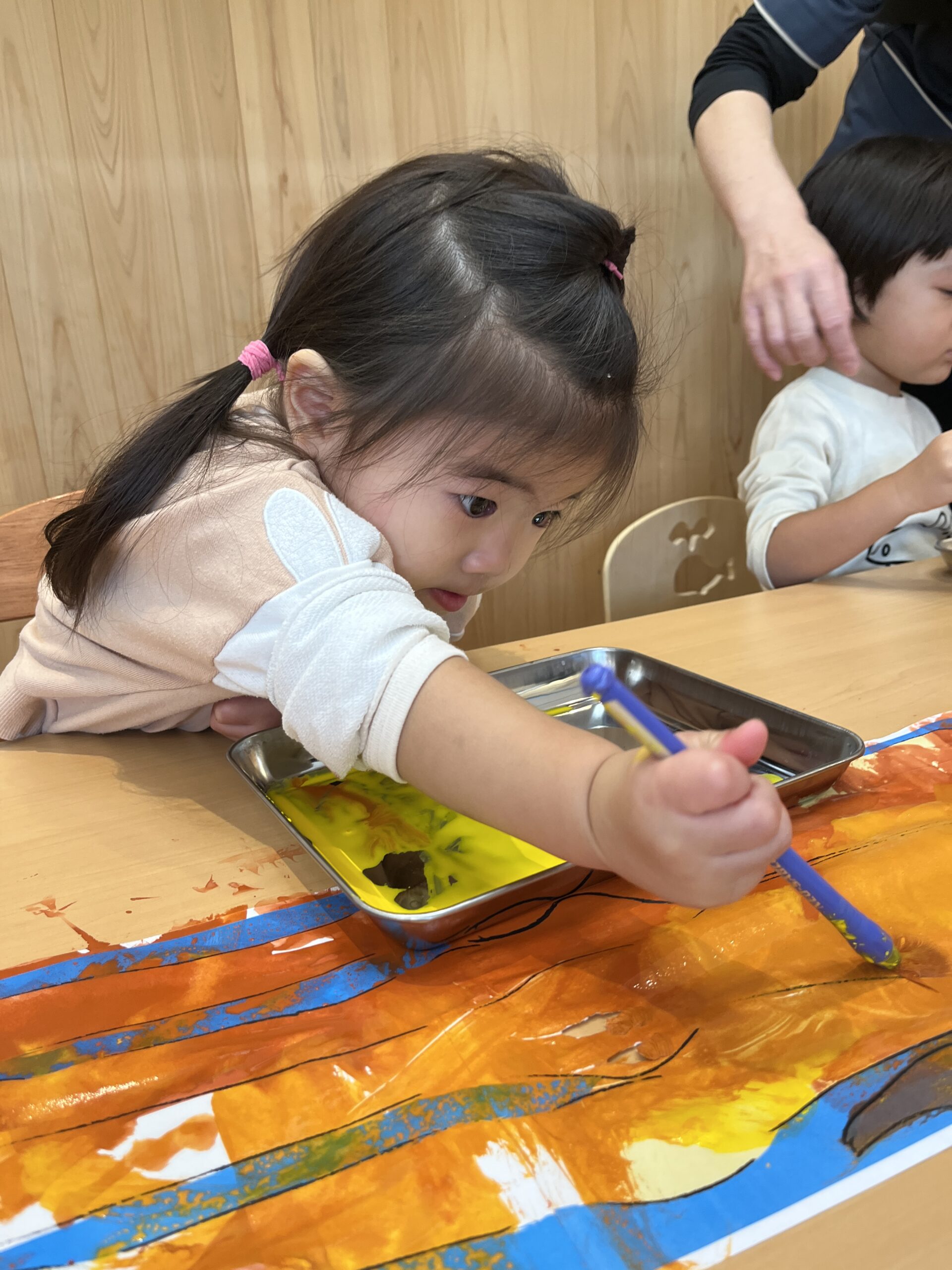 今日は晴れ。保育室ではサイエンス+の日でした。「今日は大きなキリンに色をぬるよ」と先生が声をかけると、「きいろにしたい!」「しましまにする!」と2歳さんがアイデアを発表。1歳さんは「ぬりぬりする!」と筆をしっかり握り、0歳さんは指で絵の具の色を見てにっこり。先生が「筆は上からそっと持って、トントンじゃなくてスーッとなでてね」と伝えると、「こう?」と2歳さんが手元を確認して集中が高まります。