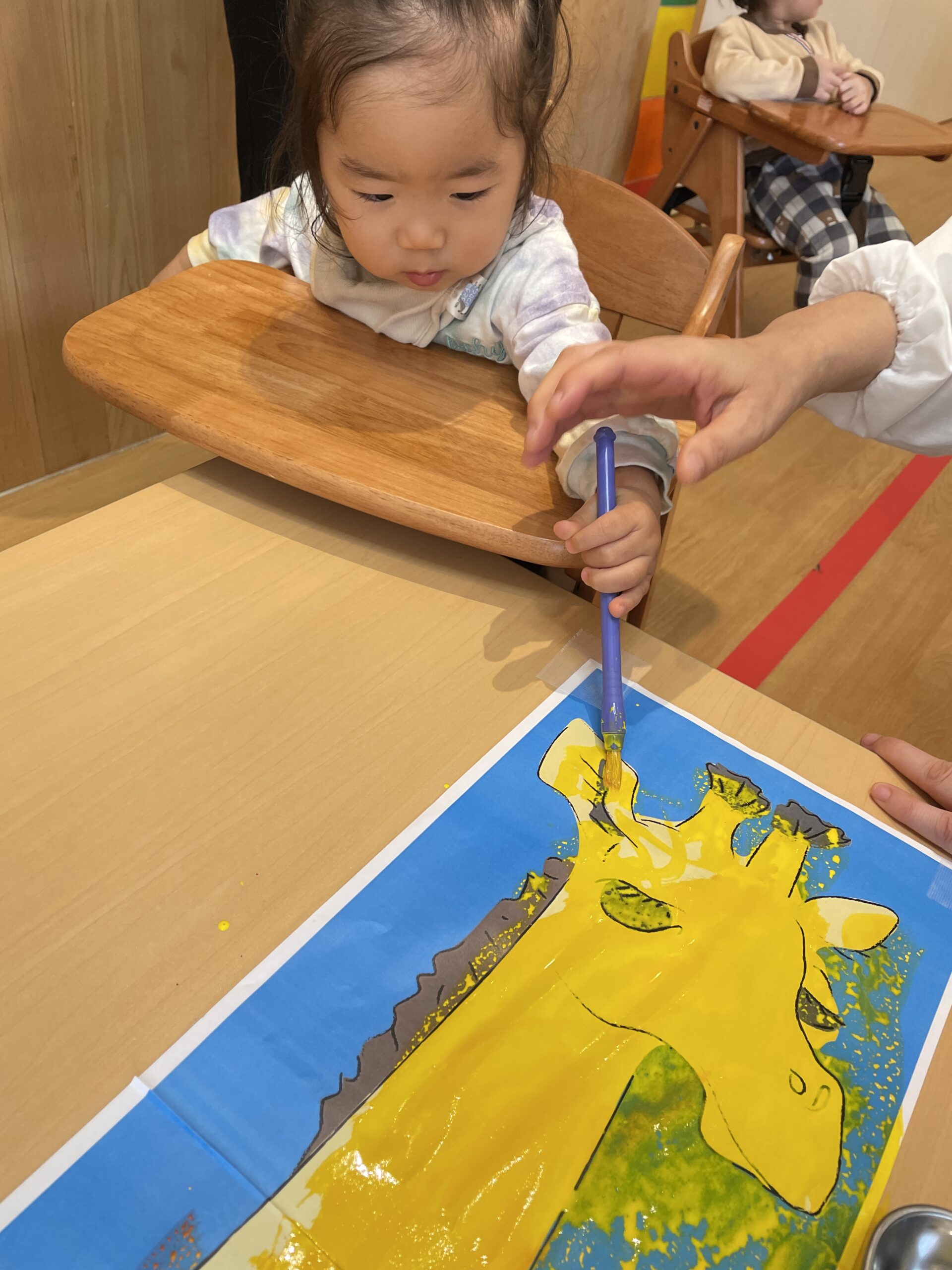 仕上げの時間。「ここ、まだ白いよ」と2歳さんが気づくと、1歳さんが「わたし、ぬる!」とバトン。先生が「交代の『どうぞ』『ありがとう』を言ってくれる?」と促すと、「どうぞ」「ありがとう」と温かいやりとりが生まれます。完成したキリンを見て「おっきい!」「かわいい!」と拍手。小規模保育の落ち着いた環境だからこそ、集中と達成感をじっくり味わえました。