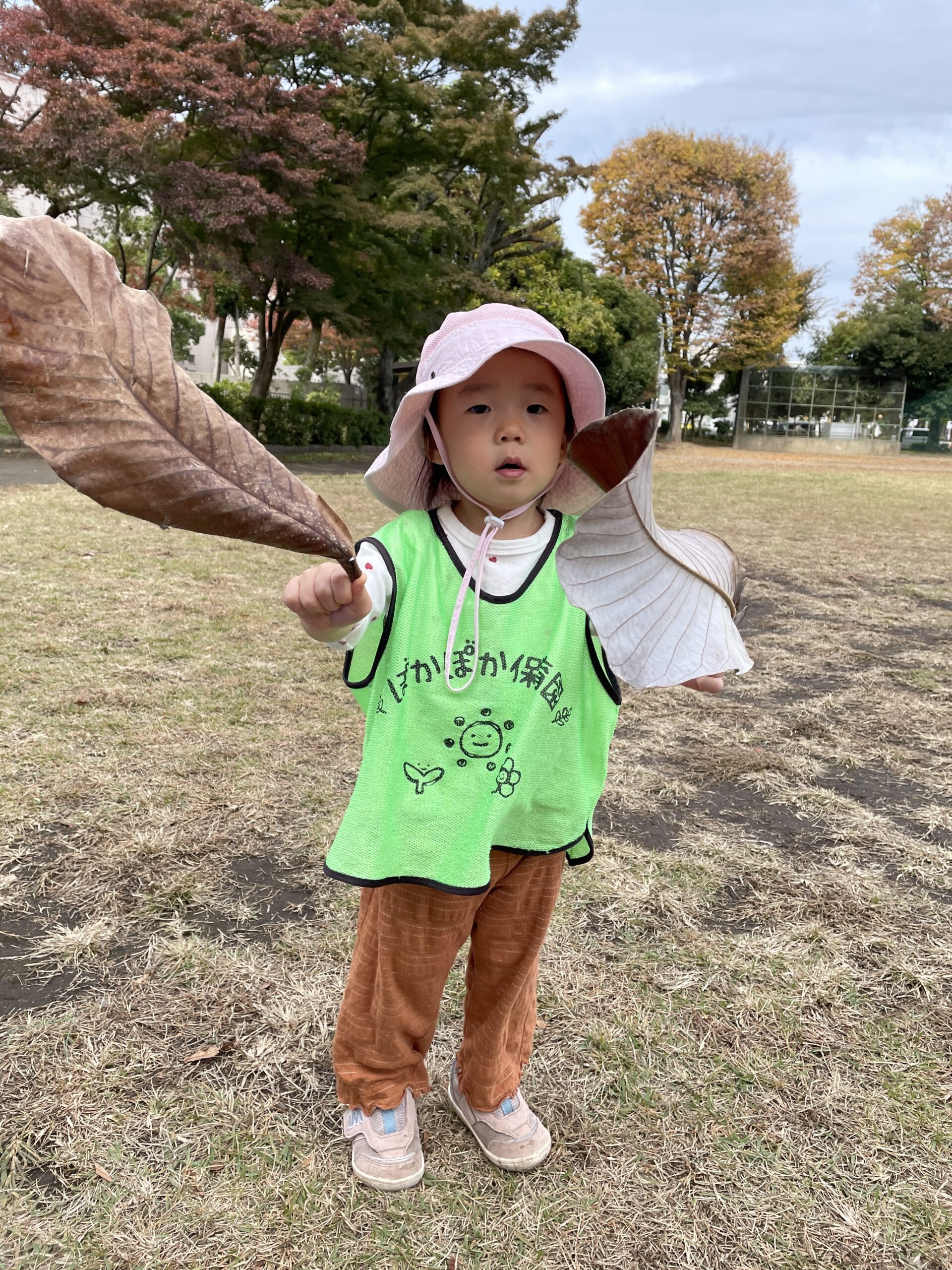 落ち葉探しも大盛り上がり。「大きいはっぱ、どこかな?」に2歳さんが「ここ、いっぱい!」と木の根元を指差し、1歳さんは「まるいの、みつけた!」と嬉しそう。先生が「製作に使うから、乾いている葉を選ぼう」と伝えると、「カサカサしてる!」と手ざわりで選別。0歳さんはベビーカーの上で葉っぱをひらひら、「あか」「きいろ」と色の言葉に触れながら、季節の変化を体いっぱいに感じました。