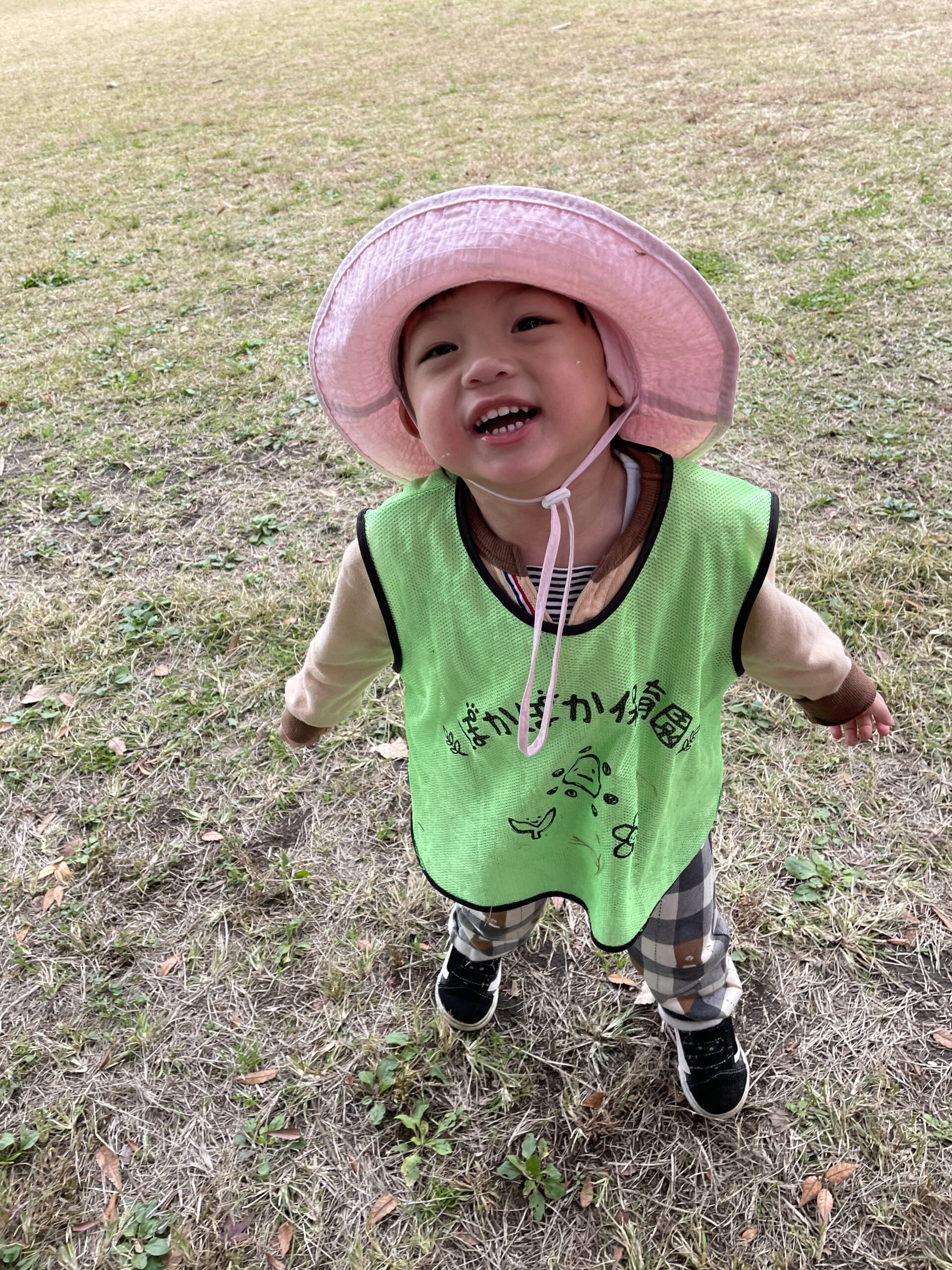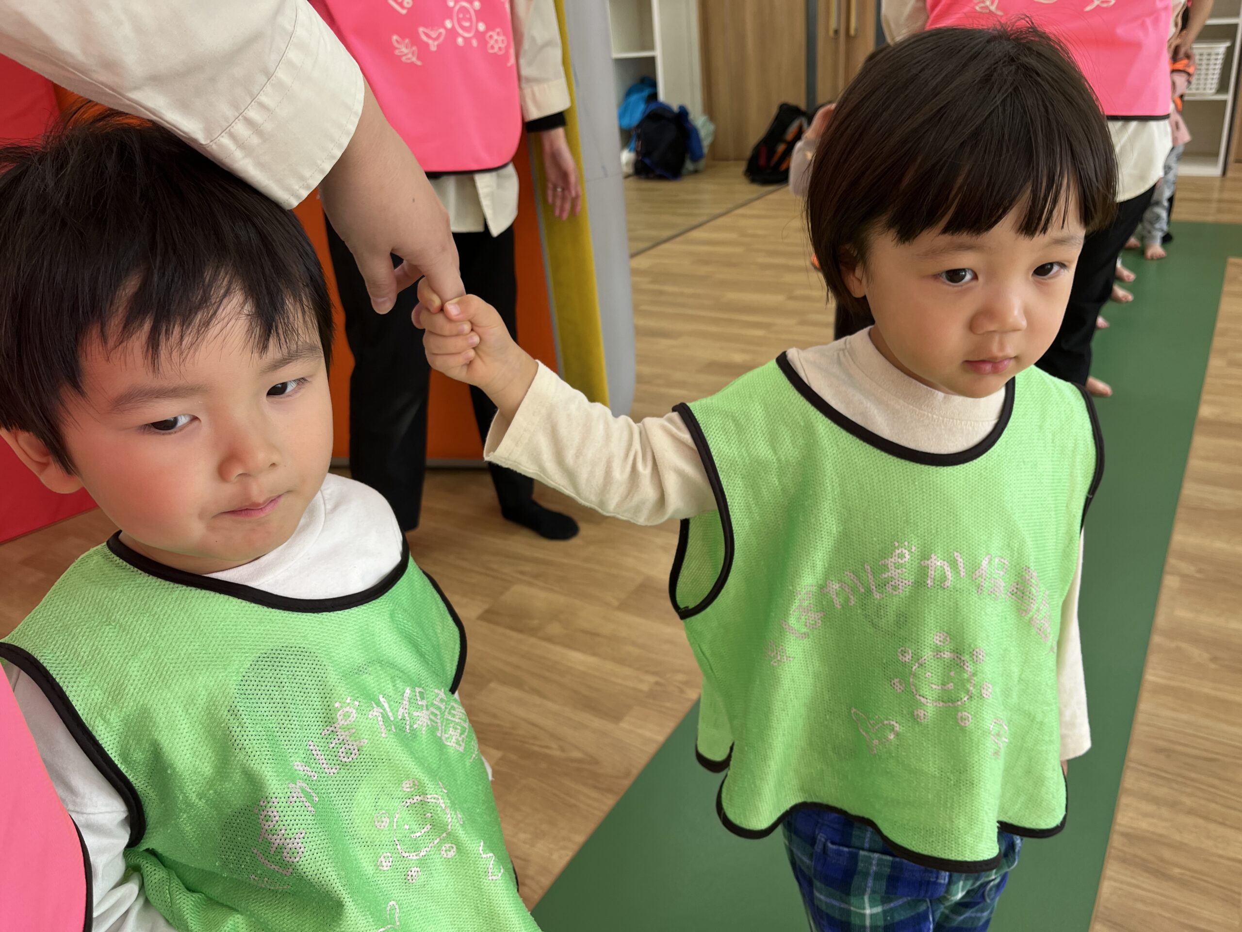 たくさん走ったあとは水分補給。「お水タイム!」の声に「おいしい!」と2歳さん。先生が「ひとくち飲んだら、ほっぺたトントンで休憩しよう」と伝え、体温・汗の様子もこまめにチェック。1歳さんはコップを両手で持つ練習を継続し、こぼさずゴクゴク。手厚い保育で、遊びと休息のバランスを整えます。帰り道は「キリンの模様、つぎもやりたい」「おおきい葉っぱ、まだあるかな」と会話が弾みました。