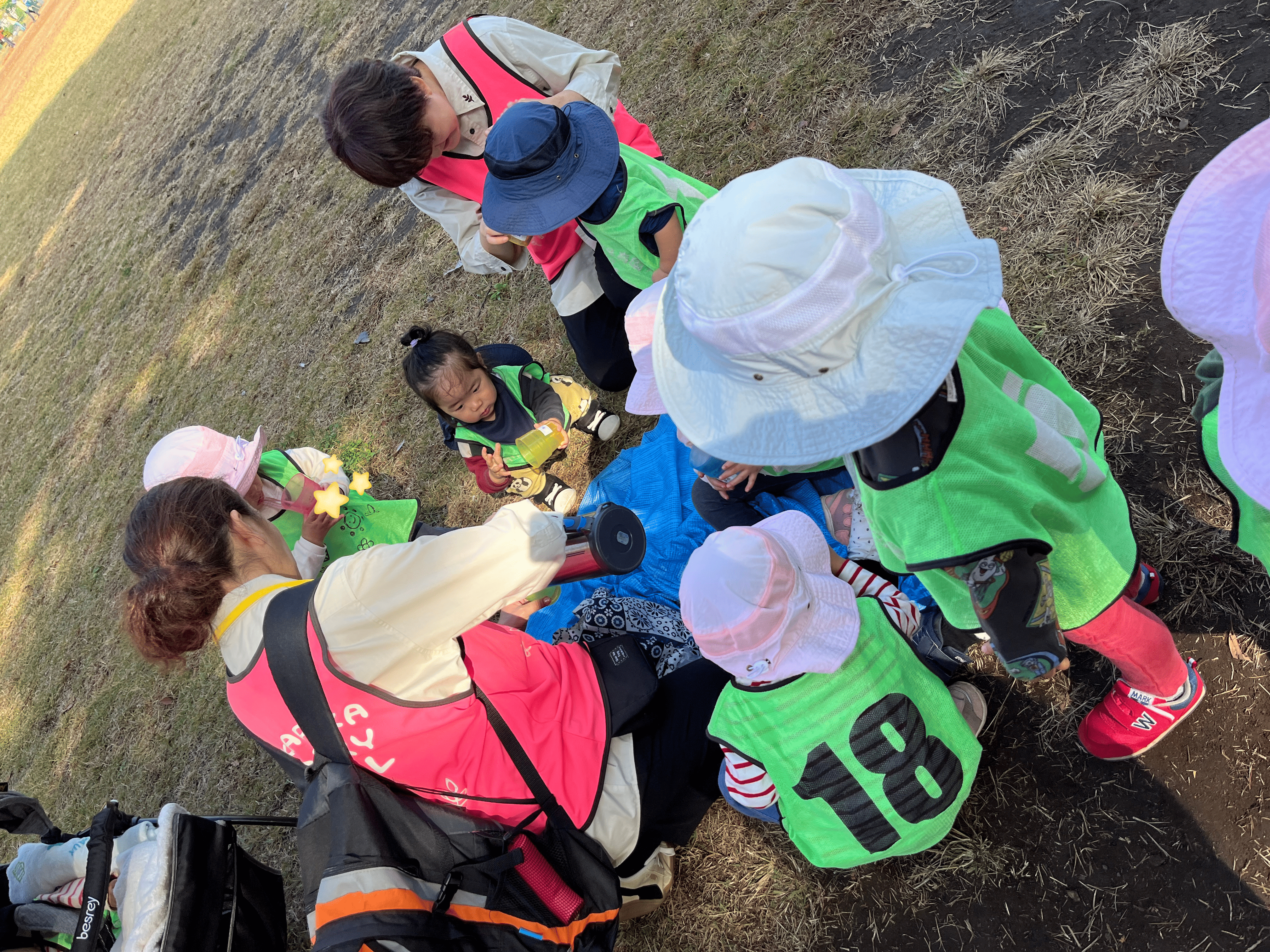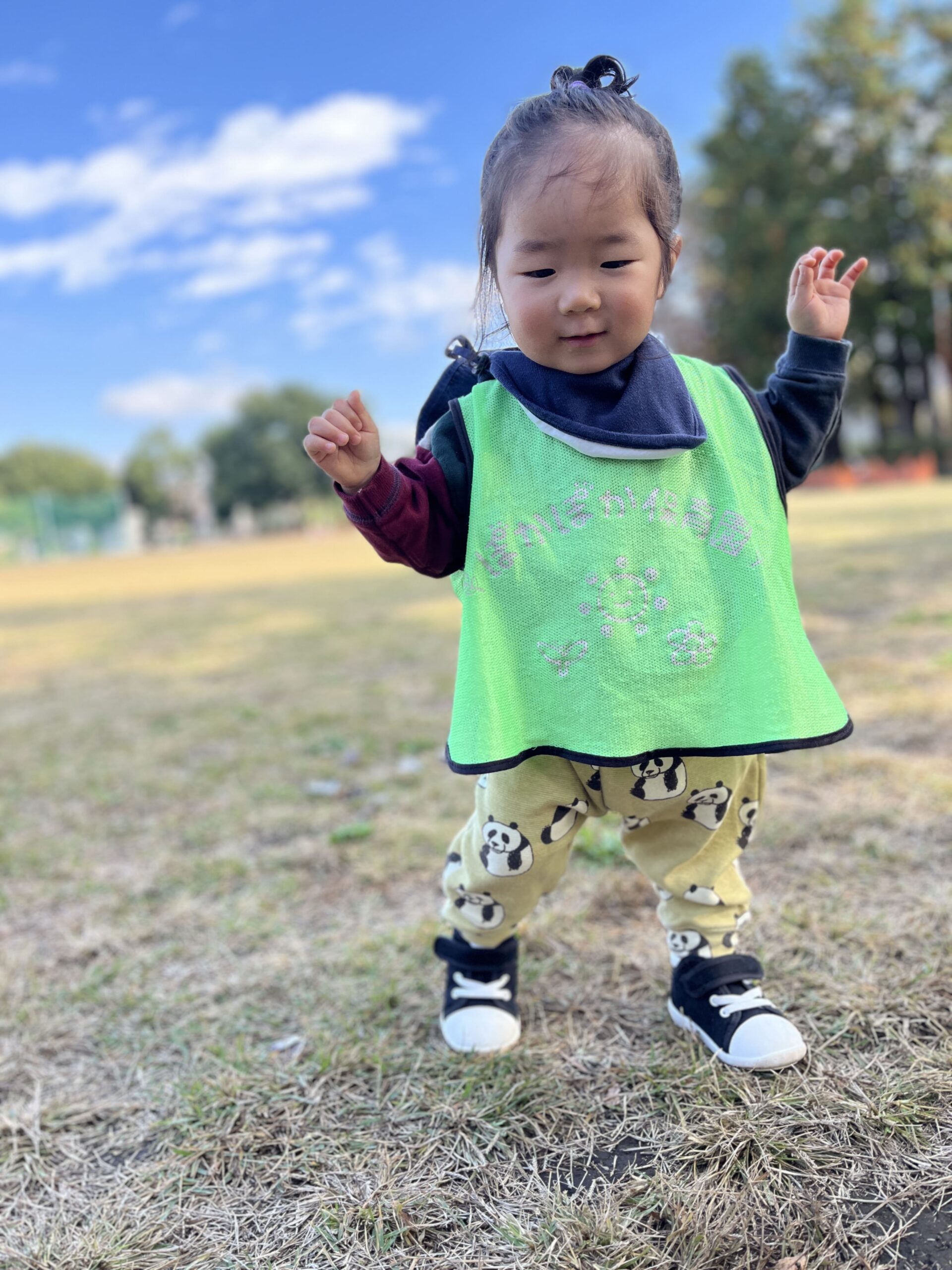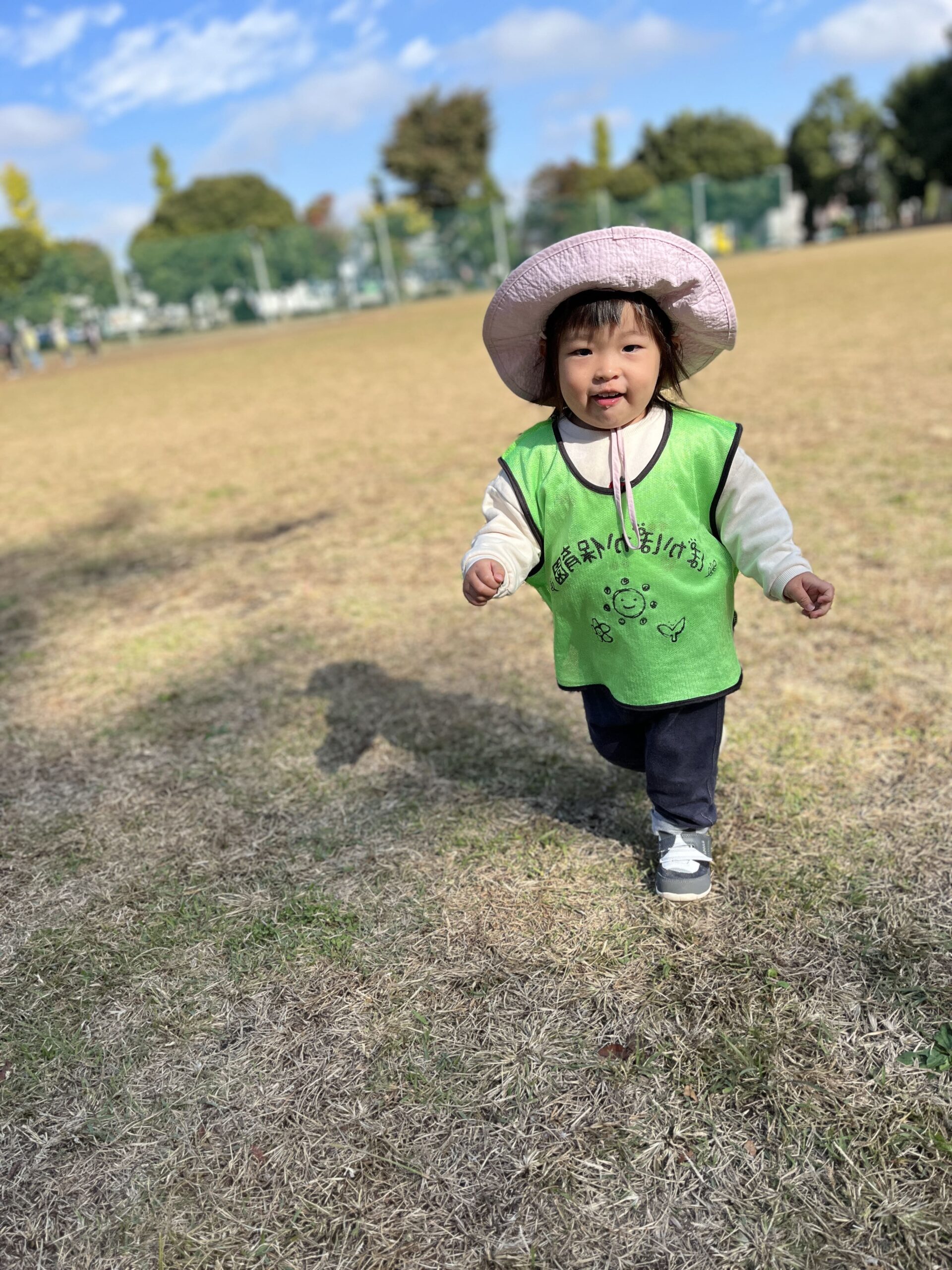 次は公園へ。「走る人、集まれー!」の先生の呼びかけに「はーい!」と元気いっぱいの2歳さん、1歳さんも「いっしょに!」と手をつないでスタート。先生が「合図は『よーい、ピッ!』だよ。前を見てぶつからないようにね」と伝えると、一斉にダッシュ。曲がり角では2歳さんが「こっち!」と友達に合図、1歳さんは「まってー!」とペースを合わせます。0歳さんはベビーカーで秋風を感じながら、笑顔で応援。「がんばれー!」の先生の声に「うん!」と親指グッのジェスチャーが返ってきました。