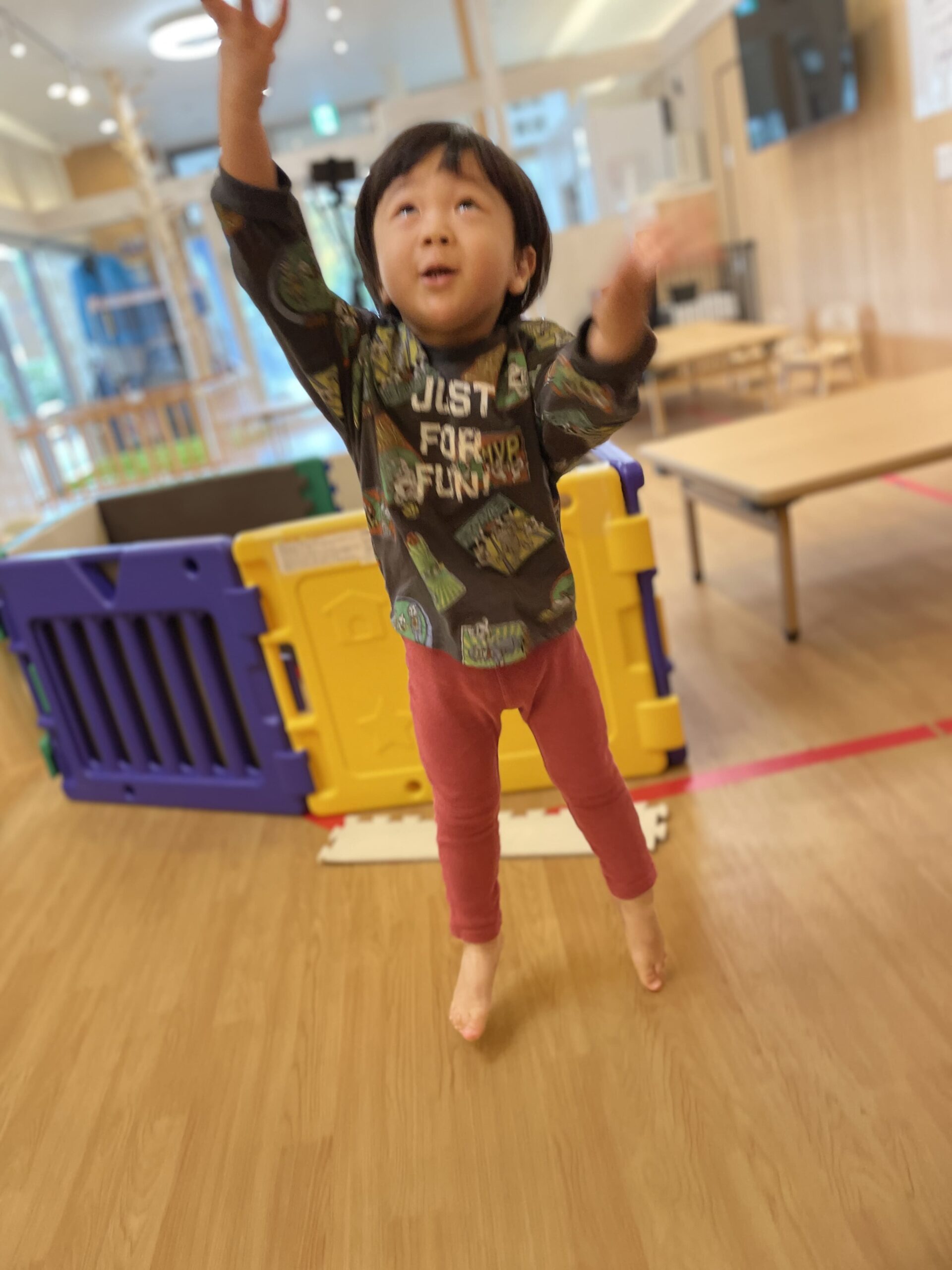 今日は晴れ。保育室では安田式体育遊びからスタートしました。「お手玉、ねらって投げてみよう!」と先生が声をかけると、2歳さんが「ここにポイ!」と的を見てスッと腕を伸ばして投げ、「できた!」と満足そう。1歳さんは「いっしょにやる!」と両手で持って胸の前からコロリンと前へ、先生が「今のフォーム、すごく上手。次は片手にも挑戦してみる?」と伝えると「やってみる!」と意欲満々。0歳さんは布の感触ににこにこ、先生が「ふわふわだね」と手を添えると、そっと落とす動きが出てきました。