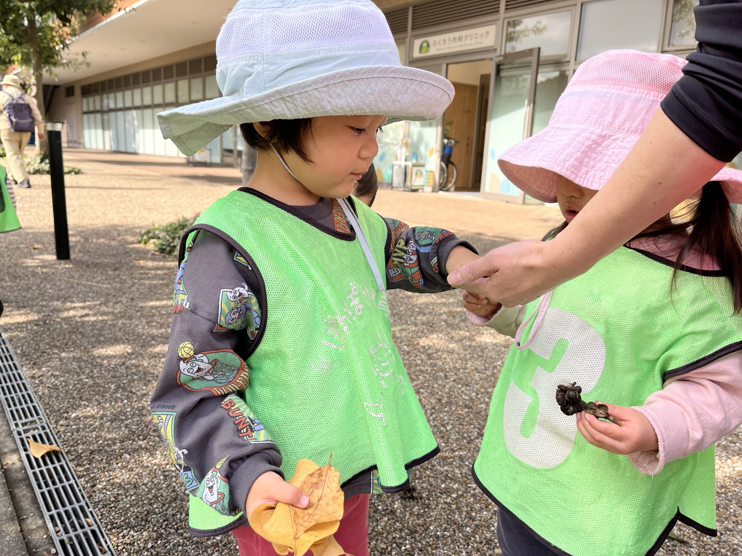 帰り道は秋のおみやげ探し。「製作で使う落ち葉、きれいな形を見つけたいね」と先生が話すと、2歳さんが「いいのあった!」、1歳さんは木の実を発見。「まるいのみつけた!」と秋を見せ合いっこしました。