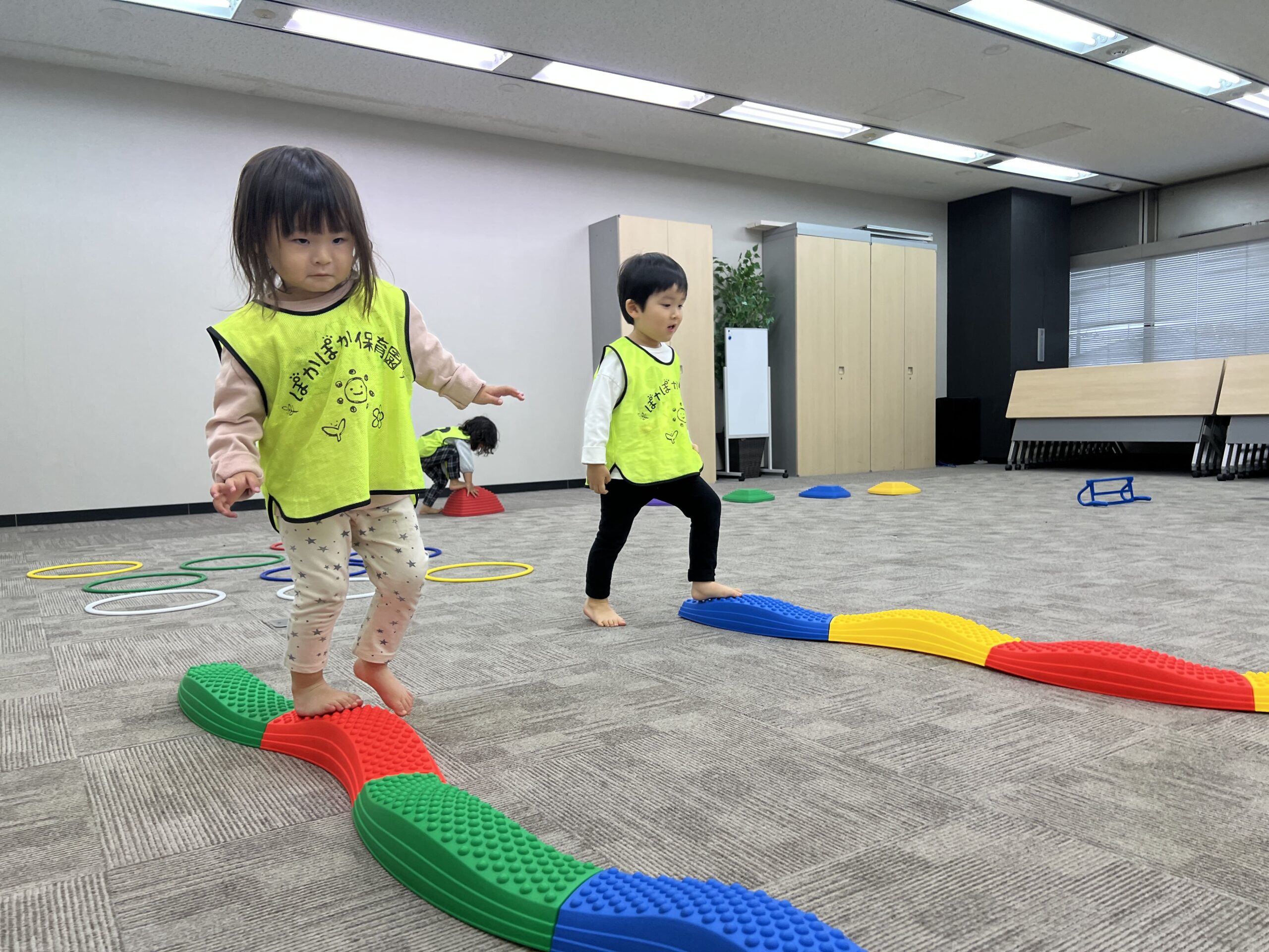 2歳さんたちは、「ここはグラグラする!」と言いながらも、慎重に、でも楽しそうにバランスを取りながら、上手に渡りきっていました。