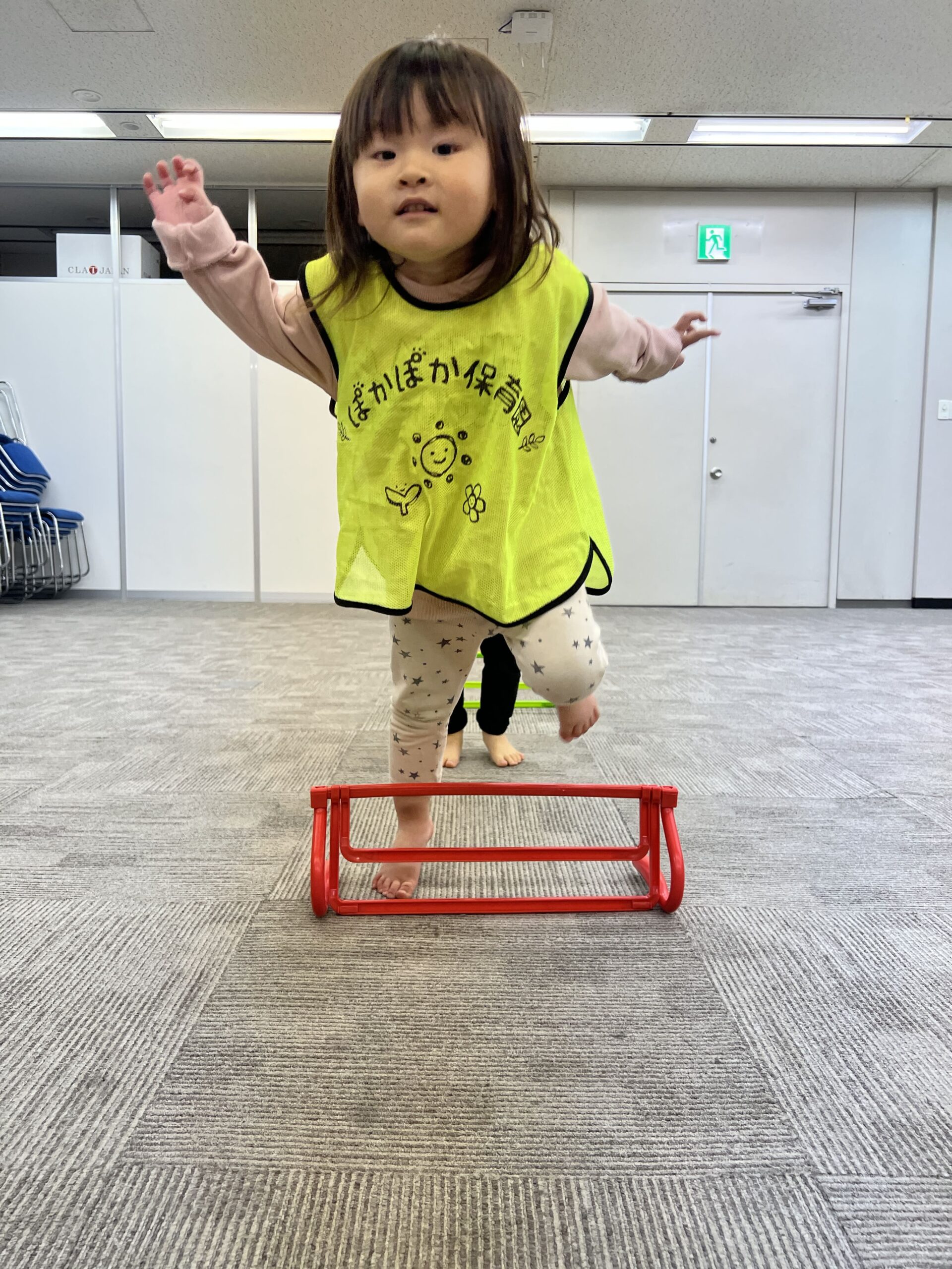 1歳さんたちは、ハードルをまたいだり、先生と手をつないで一緒に越えたり。
