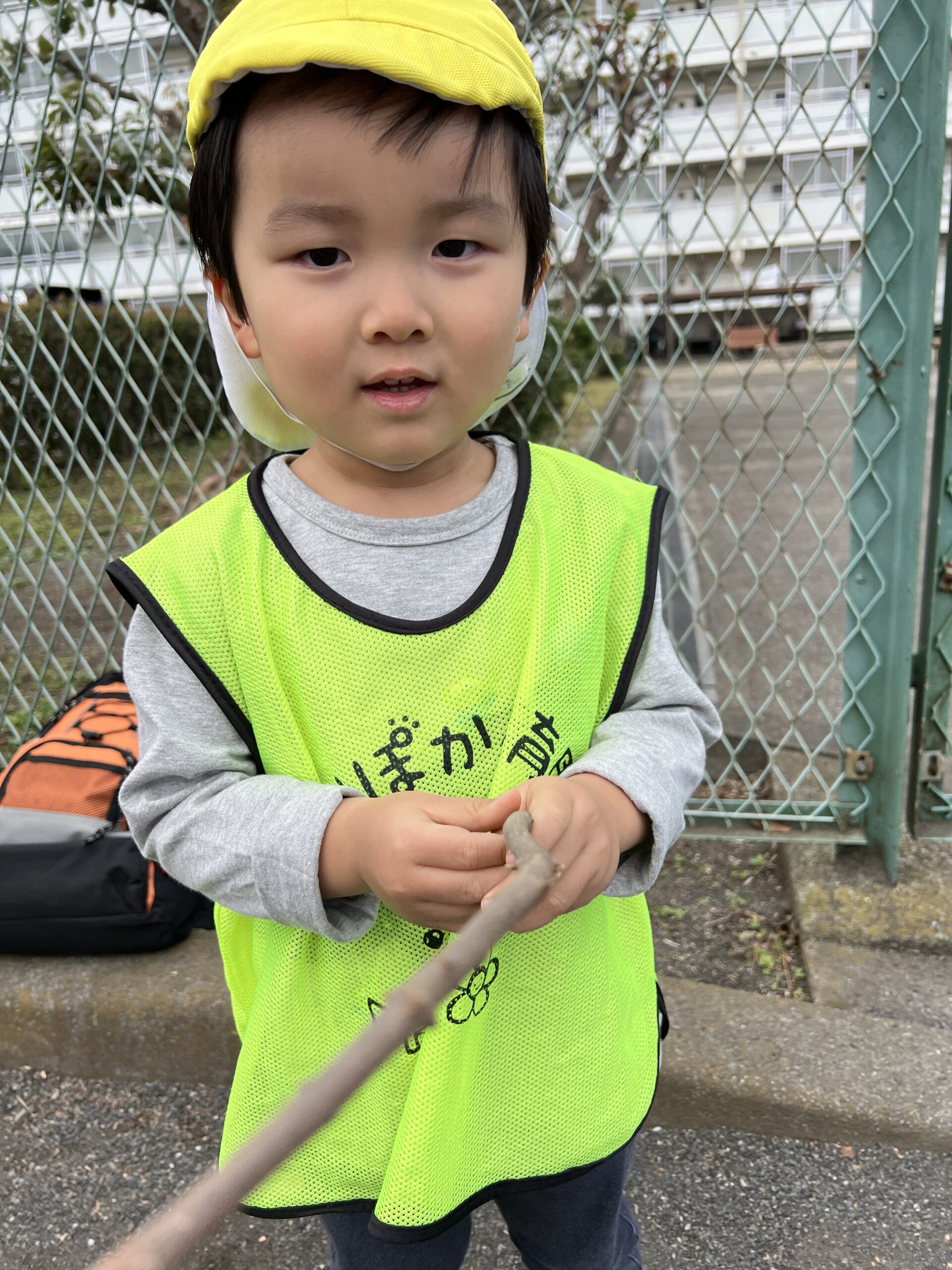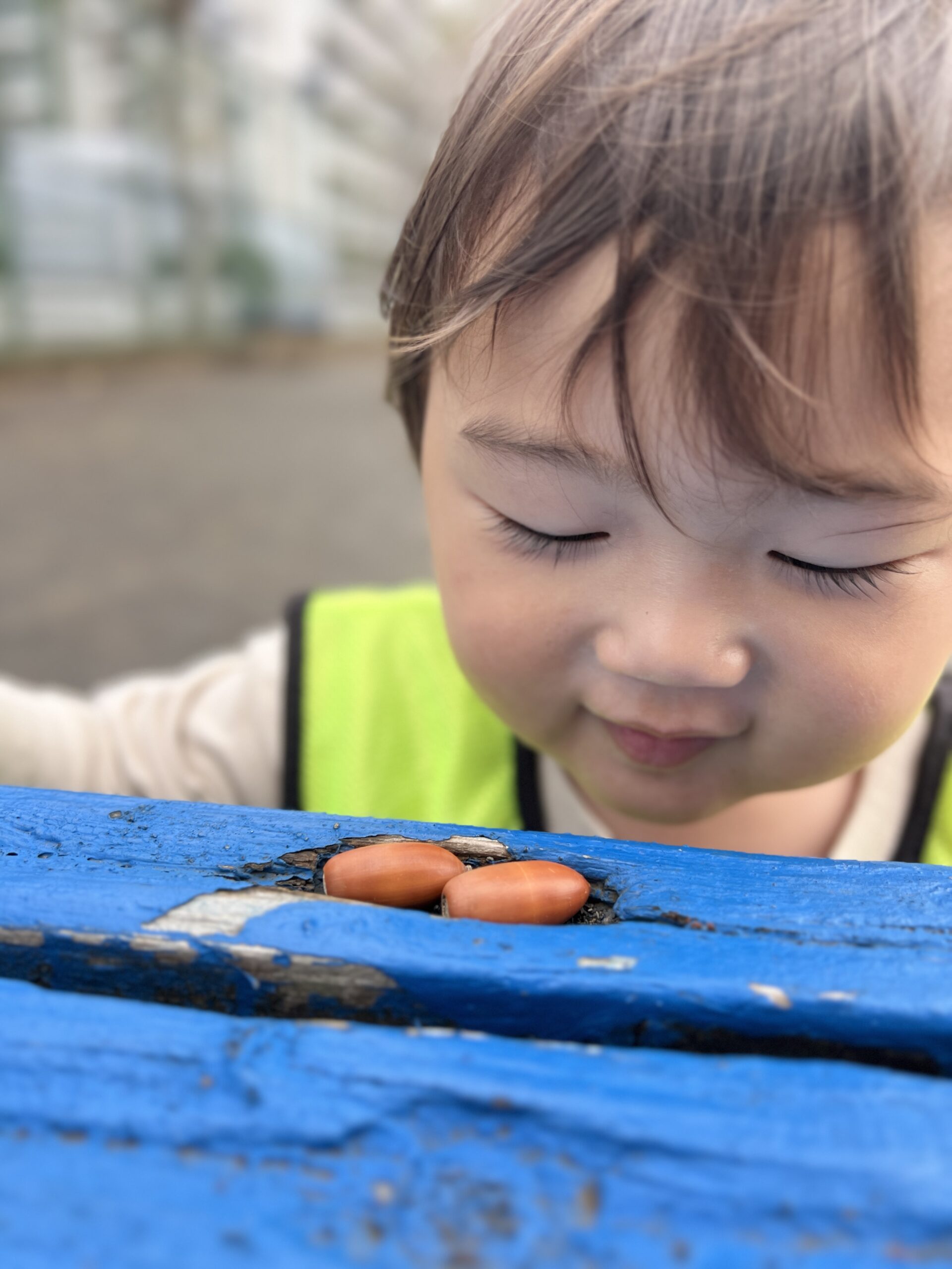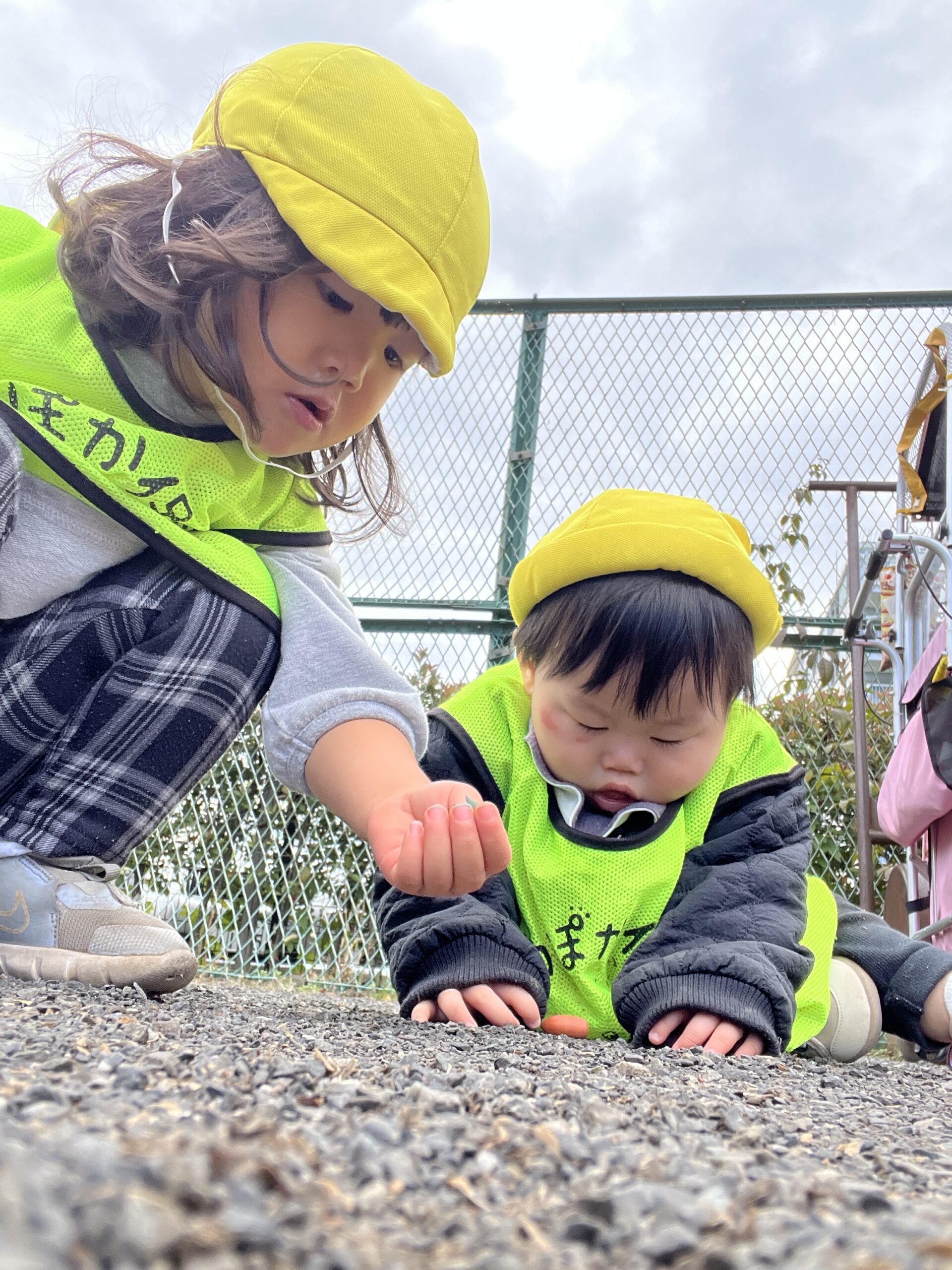 帰り道、「今日は何がいちばん楽しかった?」に2歳さんが「ボールのキック!遠くまでいったよ」、1歳さんは「どんぐりいっぱい!」と元気に報告。0歳さんは先生の指差しに合わせて「うー」とおしゃべり、みんなで「また来ようね」と嬉しい気持ちを共有しました。保育室に戻ってからは見つけた落ち葉を並べ、「大きい・小さい」「まるい・とがってる」を言葉で表現!!