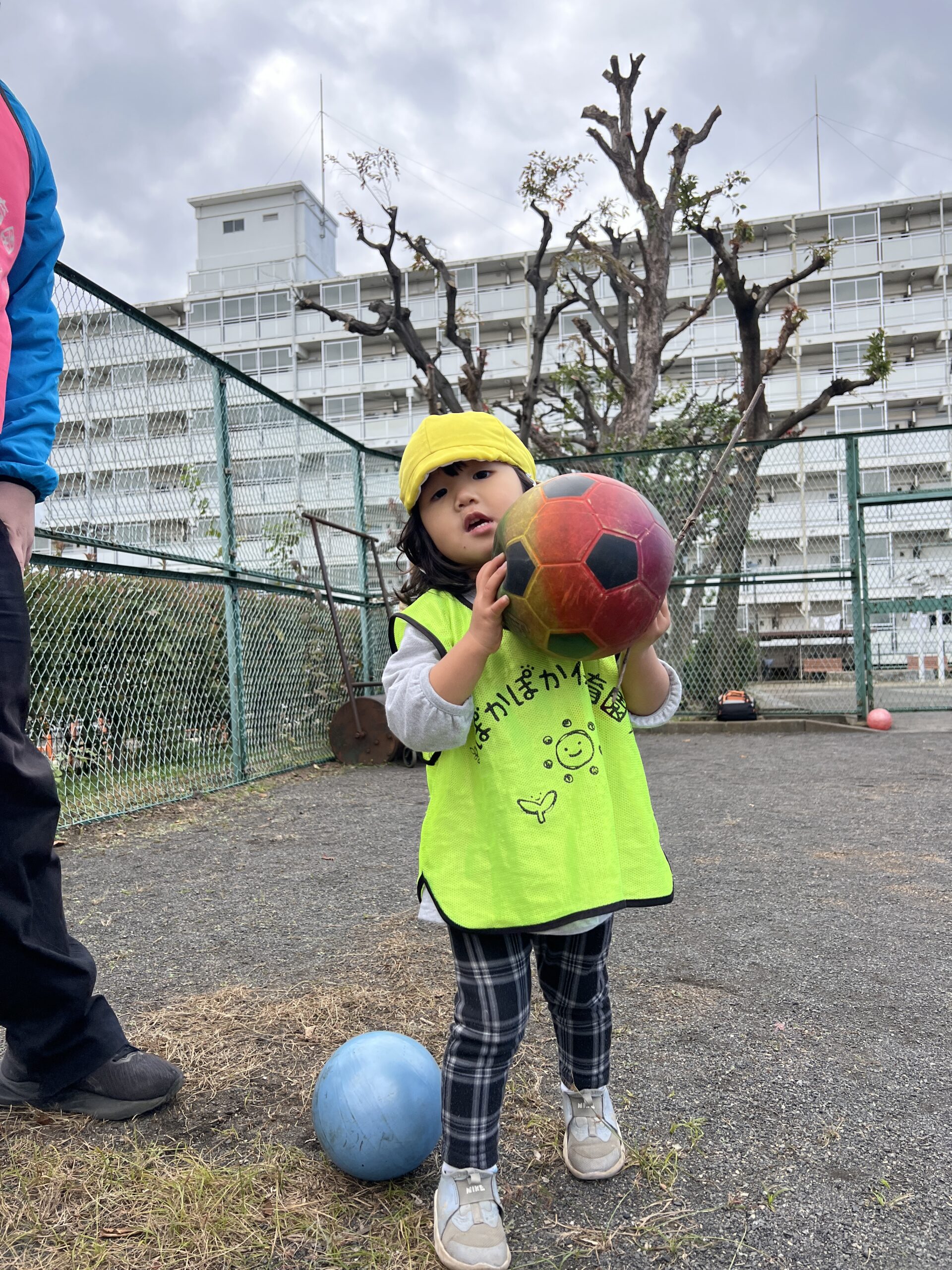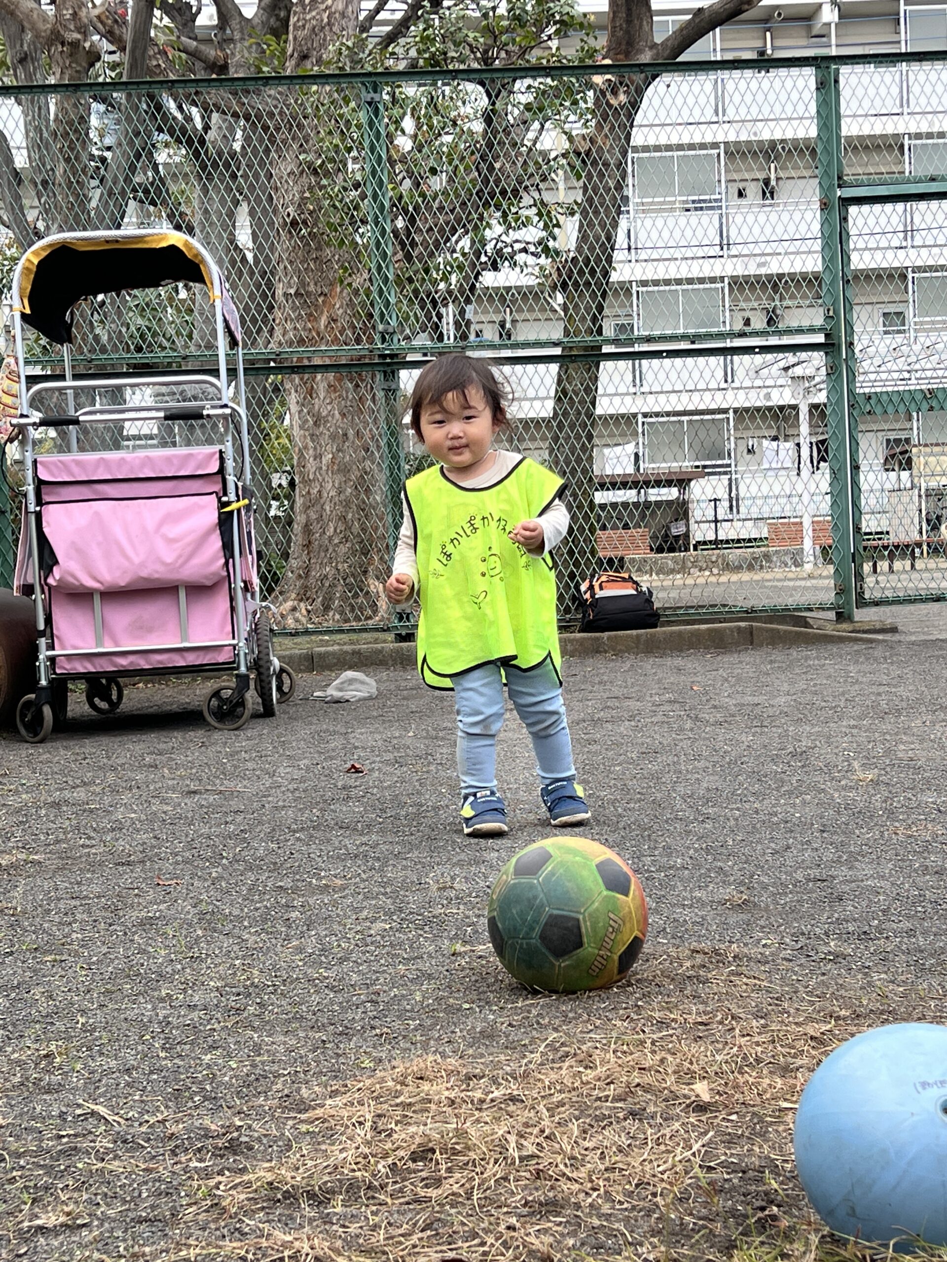 広場ではボールあそびからスタート。「コロコロ、キャッチできるかな?」に1歳さんが両手を広げて挑戦、コツンと受け止めると「できた!」と嬉しい表情!2歳さんは「けってみるよ!」と助走をつけてキック、先生が「ナイスコース!」と声をかけると誇らしげな笑顔。0歳さんは先生の足元でやわらかボールをコロコロ、手に触れるたび「んっ」と小さな声が弾み、みんなの輪の中にいる安心感が広がります。