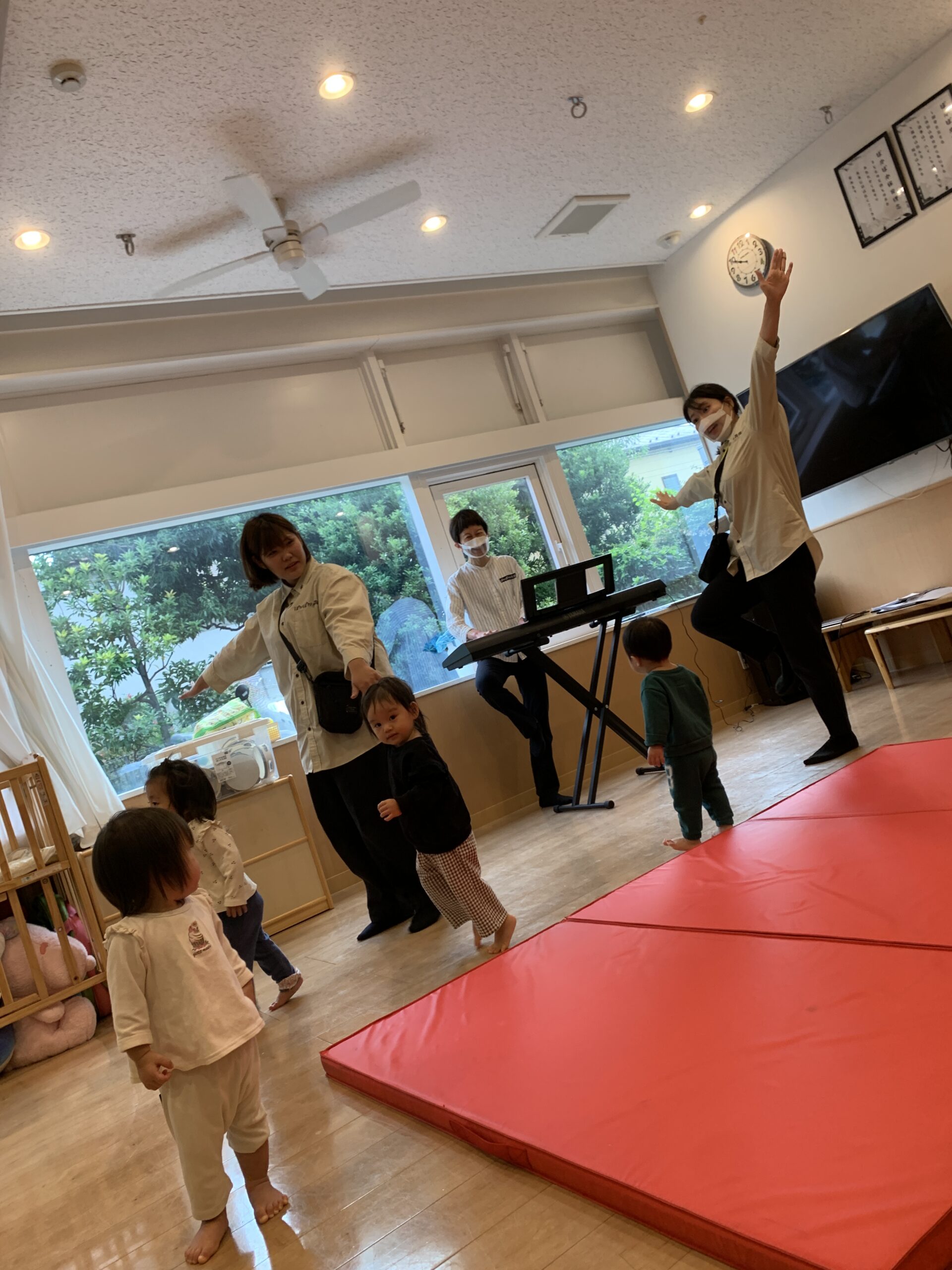 室内で音楽遊びを楽しんだ後、みんなで公園へお出かけすることにしました。