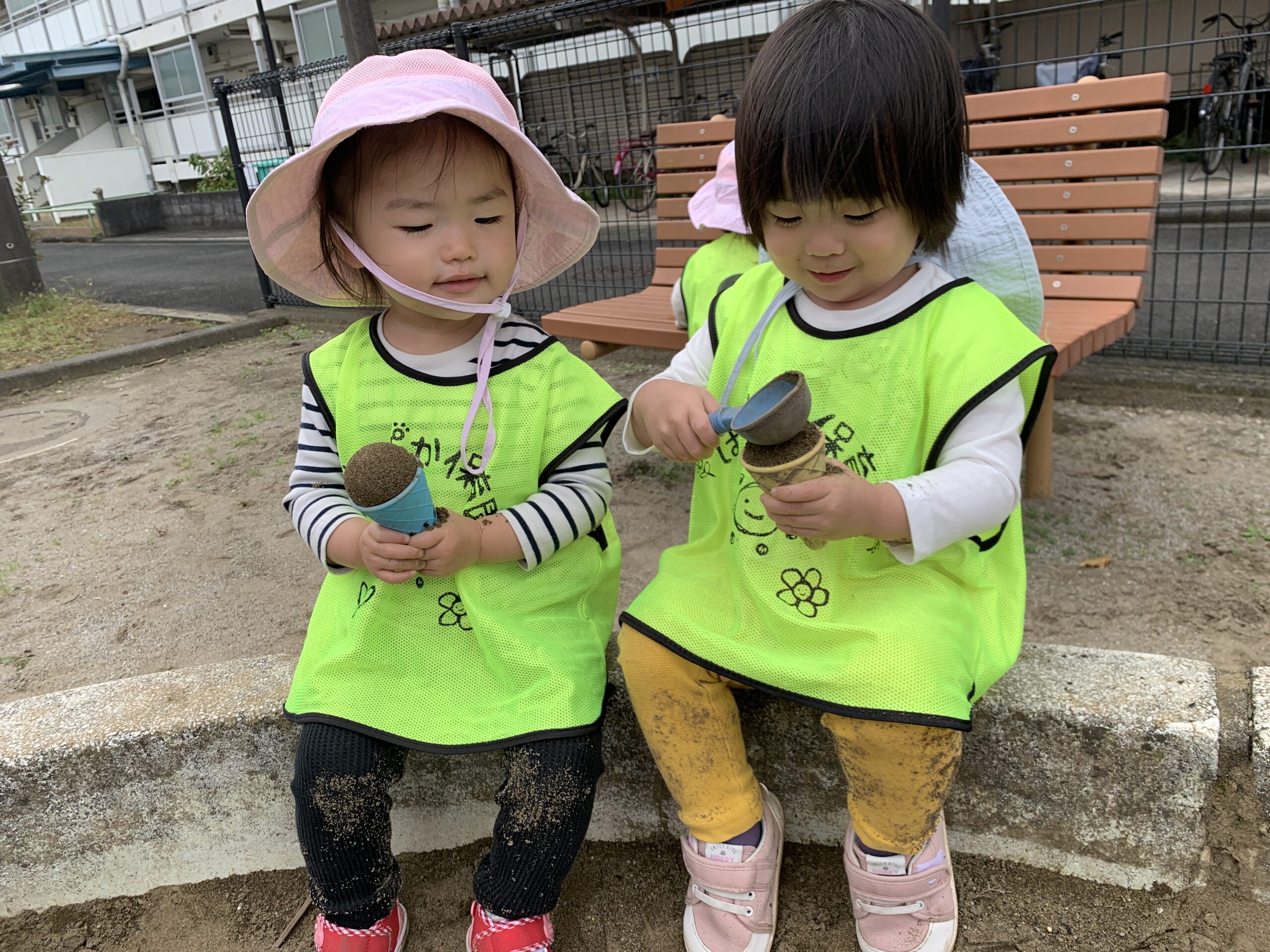 砂場では、みんなでアイスクリーム作りに夢中です。