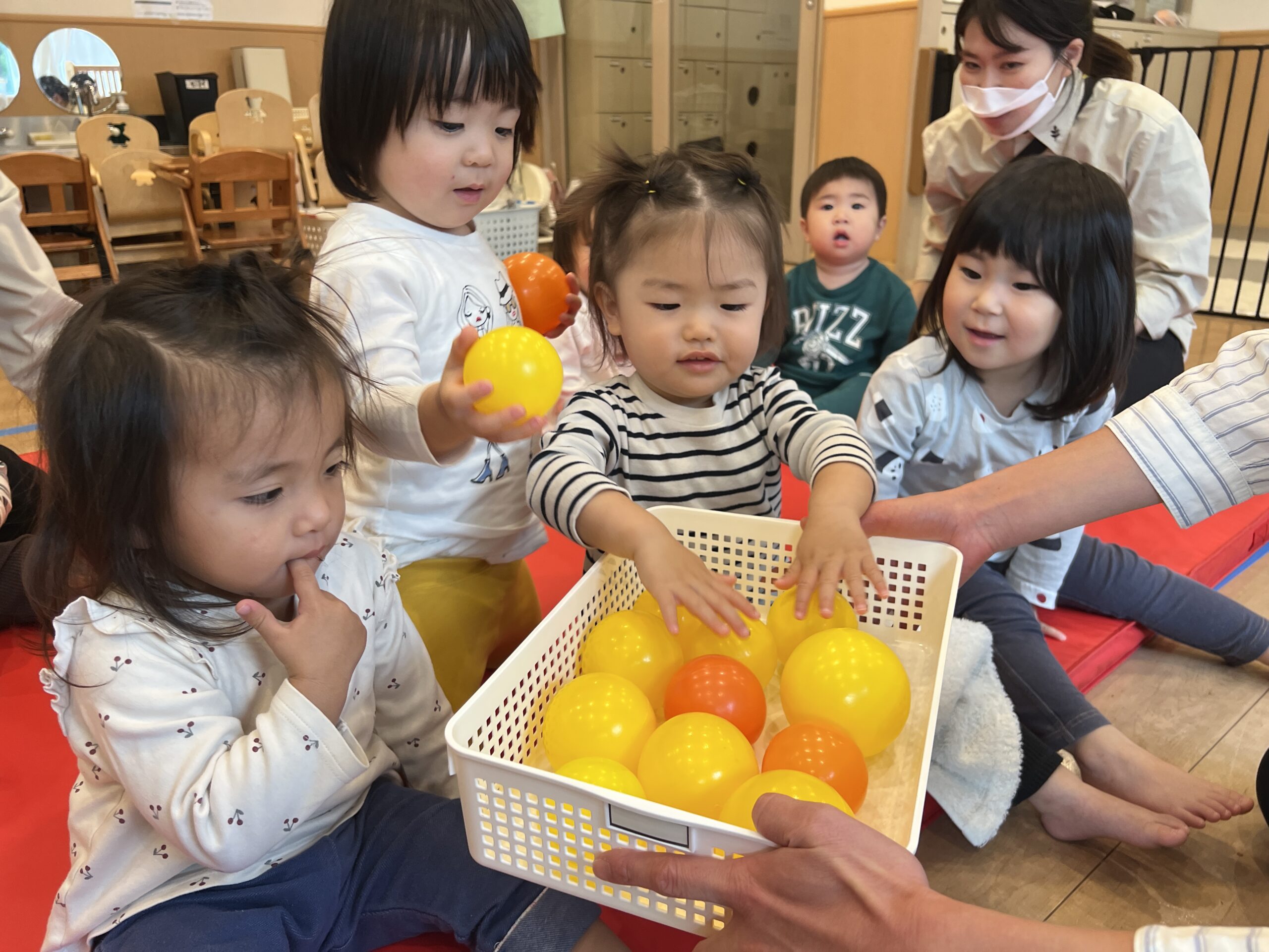 続いて、「どんぐりころころ」の歌に合わせて、カラーボール遊びです。