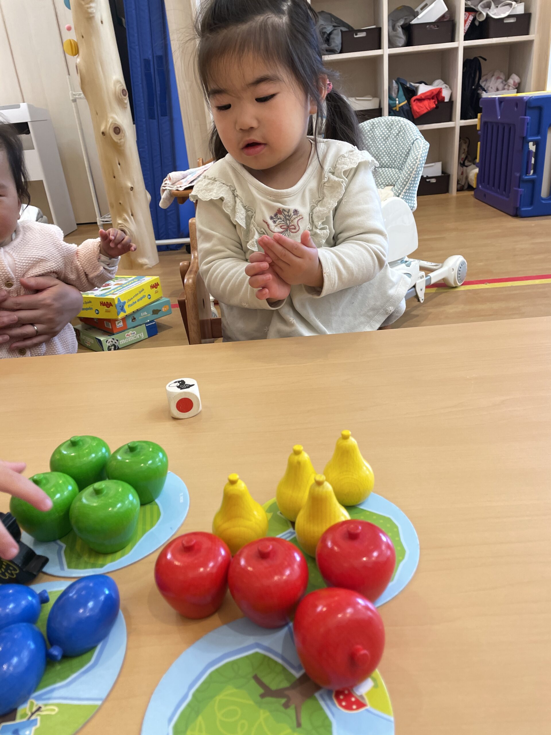 今日は晴れ。まずは保育室でアナログゲームに挑戦しました。2歳さんはルールを聞くと「まるのカード、どこかな?」と探す目が真剣、先生が「見つけたらそっと置こうね」に「うん!」と元気に返事!1歳さんは先生とペアでカードを並べ、「これ、いっしょ?」と友達に見せ合い笑顔が広がります。0歳さんは布カードを手で触って感触を楽しみ、先生が「ふわふわだね、嬉しいね」と語りかけるとにこにこ。仲良しで遊びながら、待つ・渡す・見るの小さな約束を身につけました。