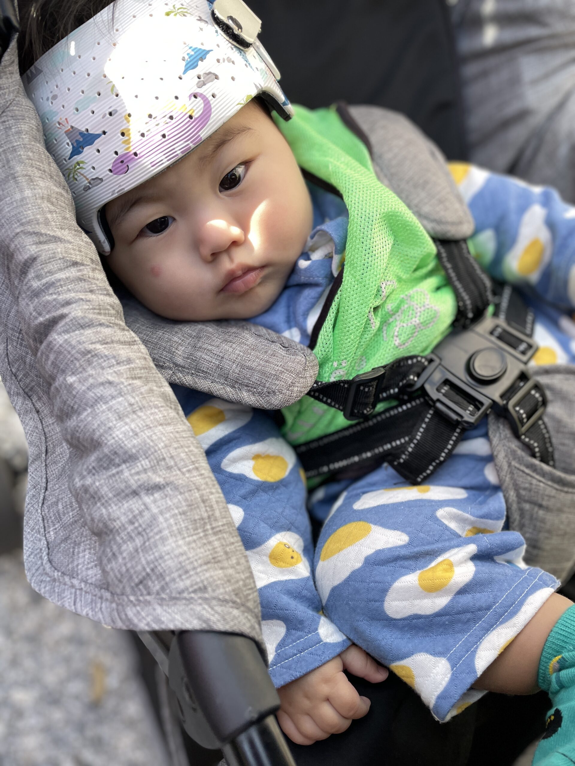 その間、0歳さん・1歳さんは外で周辺お散歩へ。0歳さんはベビーカーで心地よく風を感じ、「あったかいね」と先生が話しかけると穏やかな表情。1歳さんは交代で先生と手をつないで歩き、「おててはぎゅー、道路は白い線の中ね」と約束を確認。信号の前で「赤は止まる、青は進む。今は?」に「赤!」と元気にお返事。友達同士で「いっしょに歩こう」と声を掛け合い、仲良しの気持ちを大切に進みます。途中、花壇の花に「きれい!」と指さし、先生が「黄色だね、丸い形だね」と言葉を重ね、嬉しい気づきを広げました。