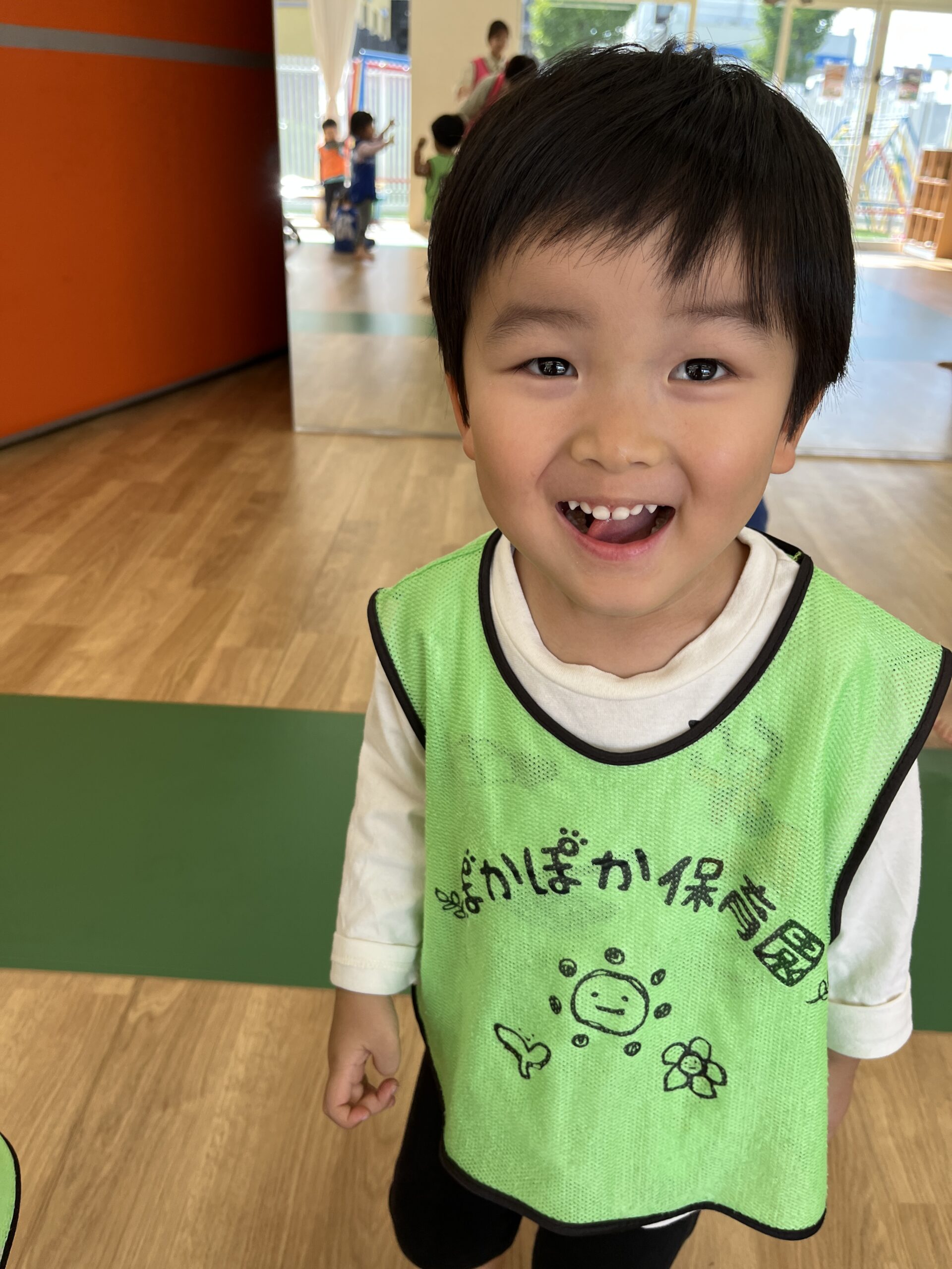 次は2歳さんがダンスへ出発。「今日はリズムでジャンプしてみよう!」に「やる!」とやる気満々。先生が「足はトン、手はパッ」と合図すると「トン・パッ!」と声をそろえ、音に合わせて体を動かします。「友達とぶつからないようにね」「まわるときはゆっくり」と伝えると、列の間隔を自分で調整する姿が頼もしかったです!