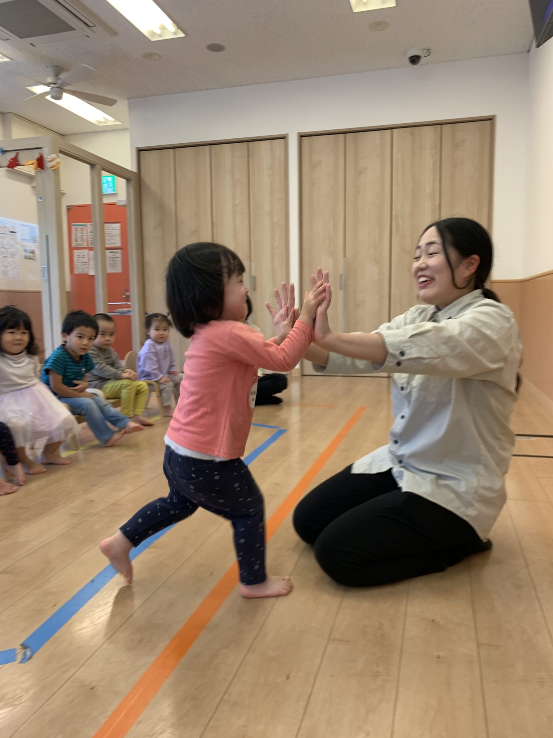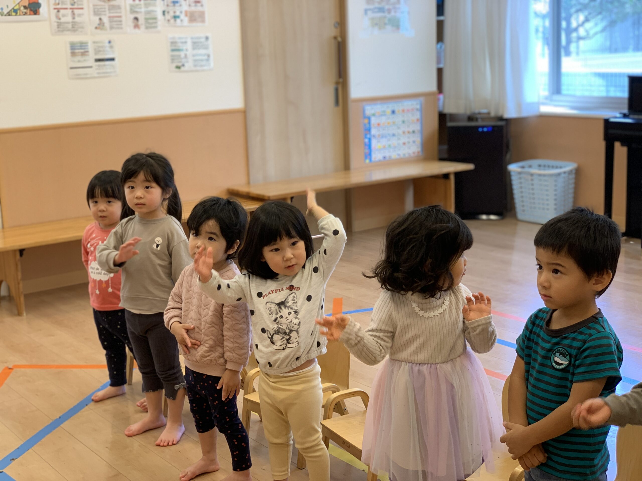 英語遊びでは歌に合わせて体を動かしたり、先生の発音を真似したりと、