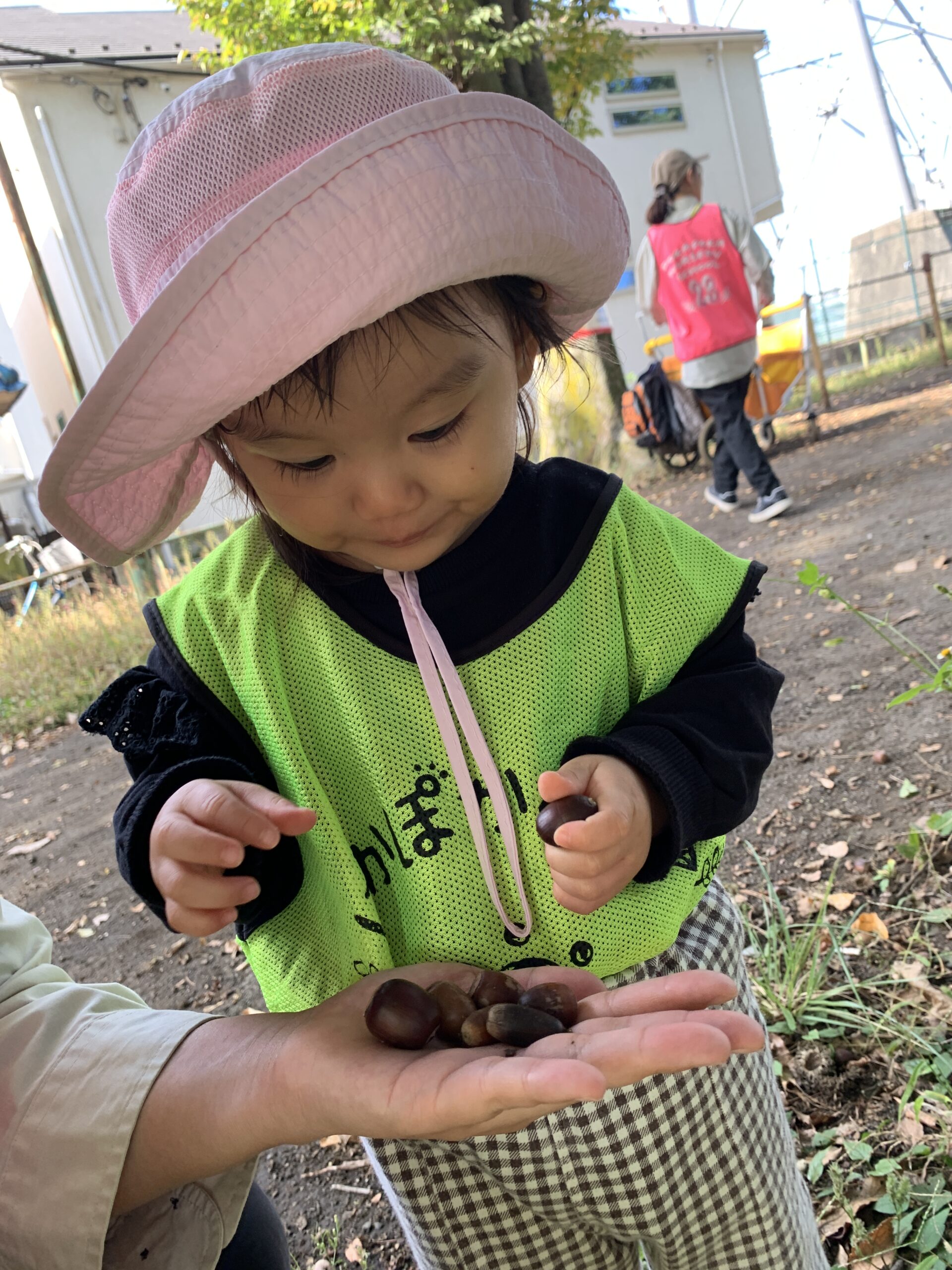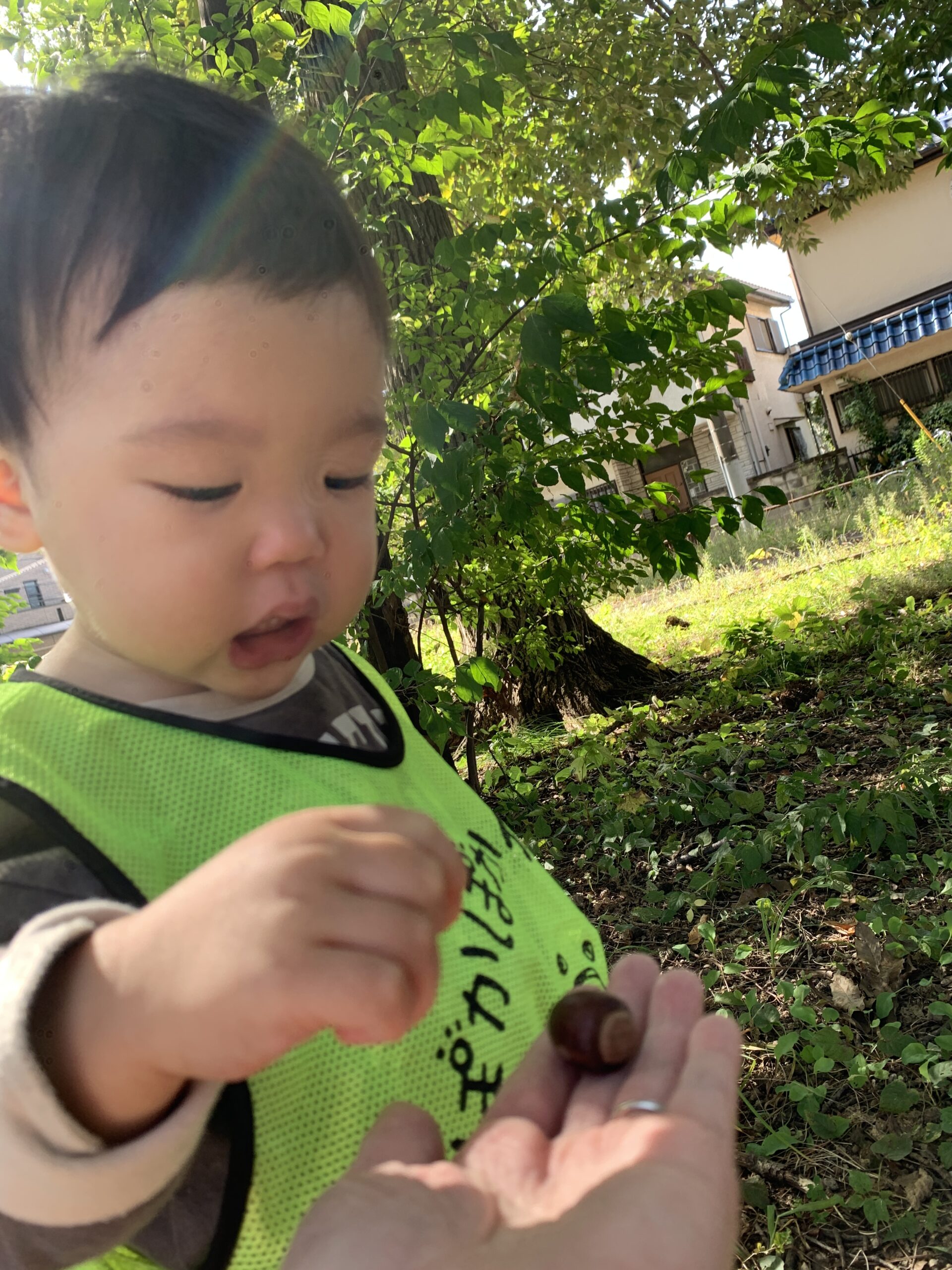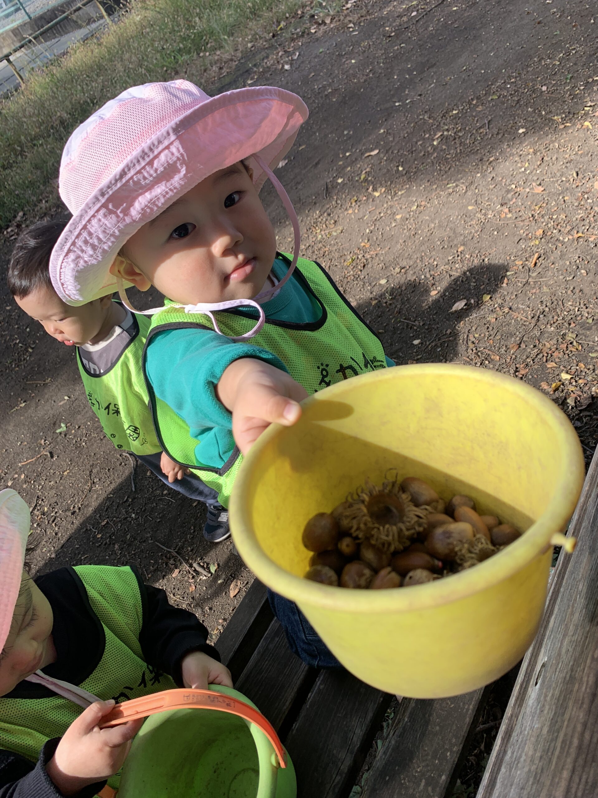 地面をじっと見つめていた子が、「あっ!どんぐり!」と、