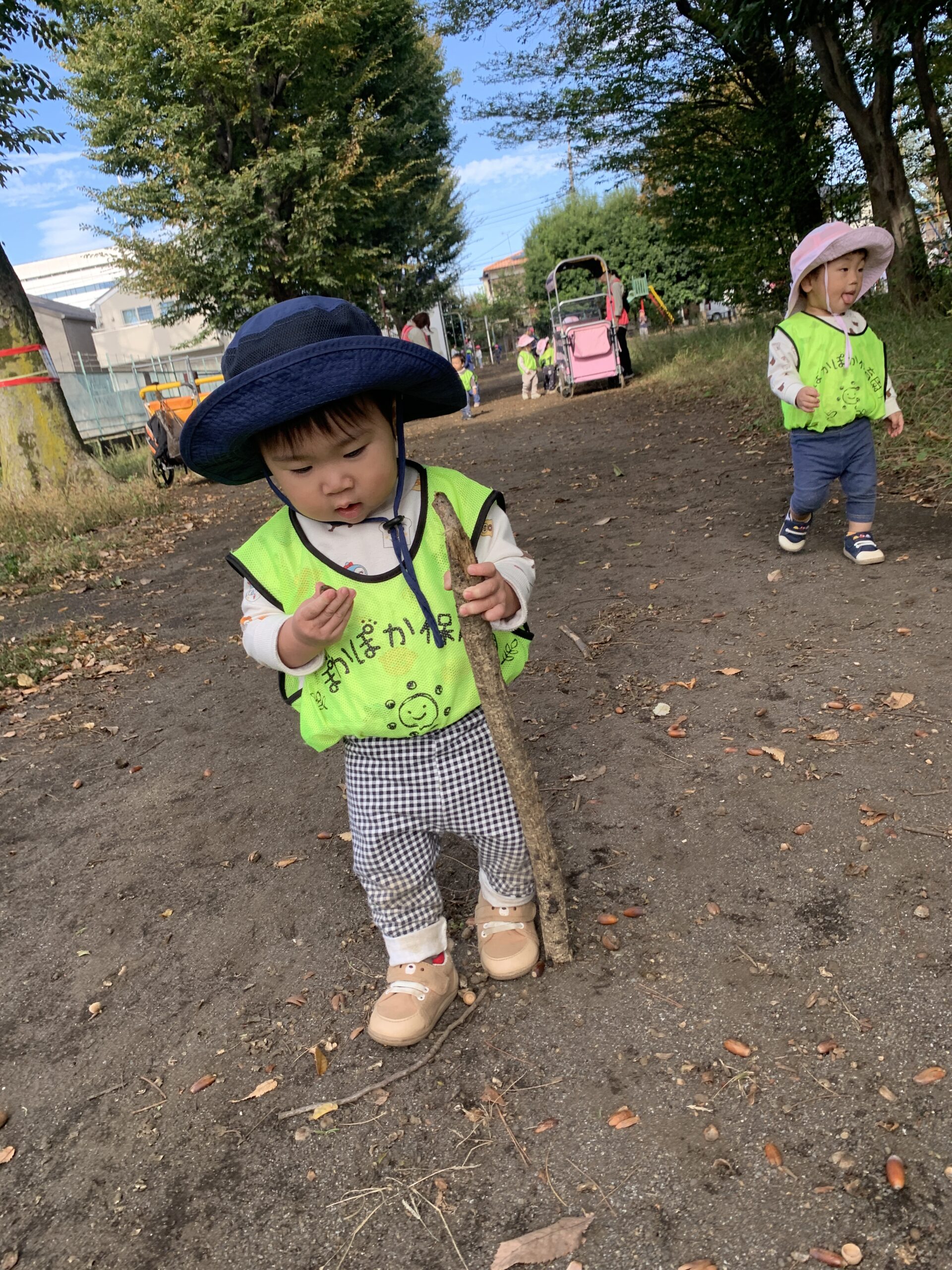 また、大きな木の棒を見つけて、それを杖のように持ち歩く子もいました。