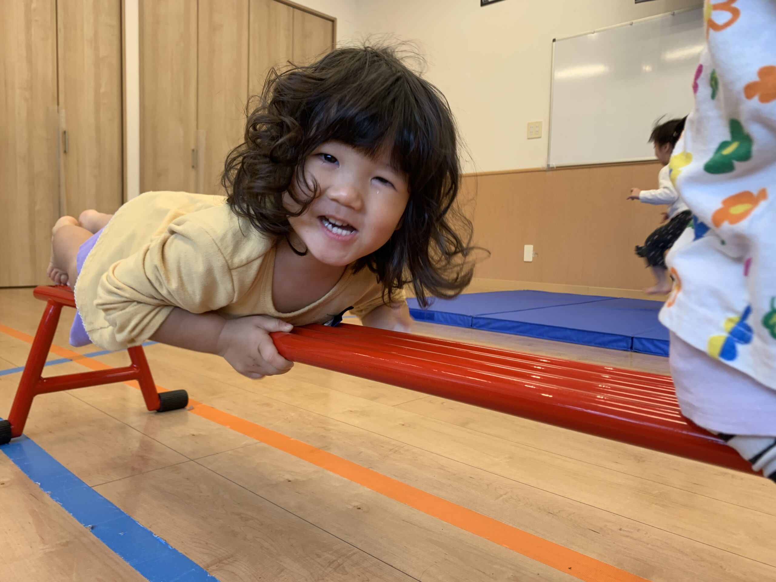 先生が「みんな、平均台をヘビさんに変身して渡るよー!」と声をかけると、