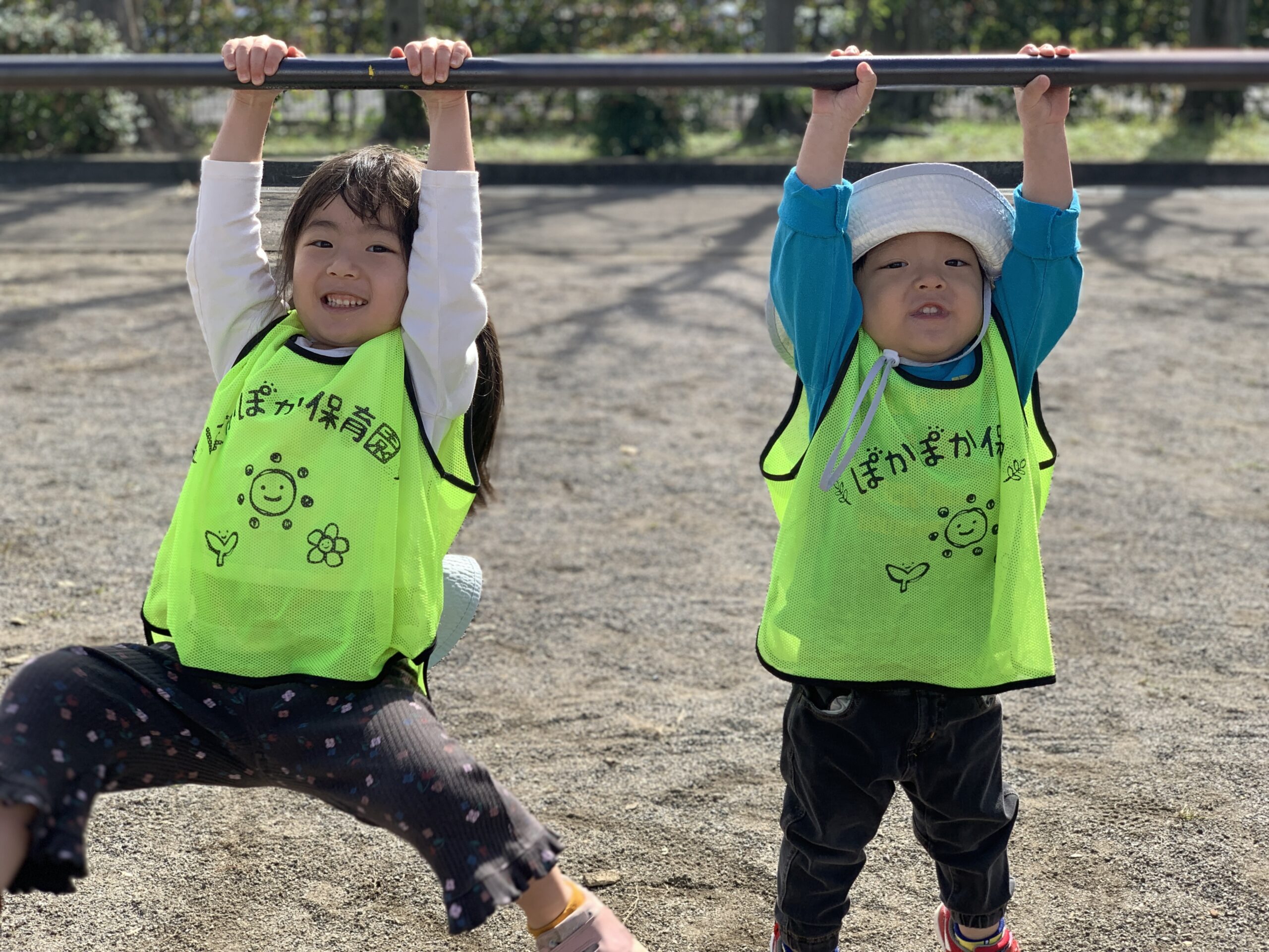 鉄棒のところでは、お友だちと一緒にぶら下がり、「きゃっきゃ」と笑いあう姿が見られ、