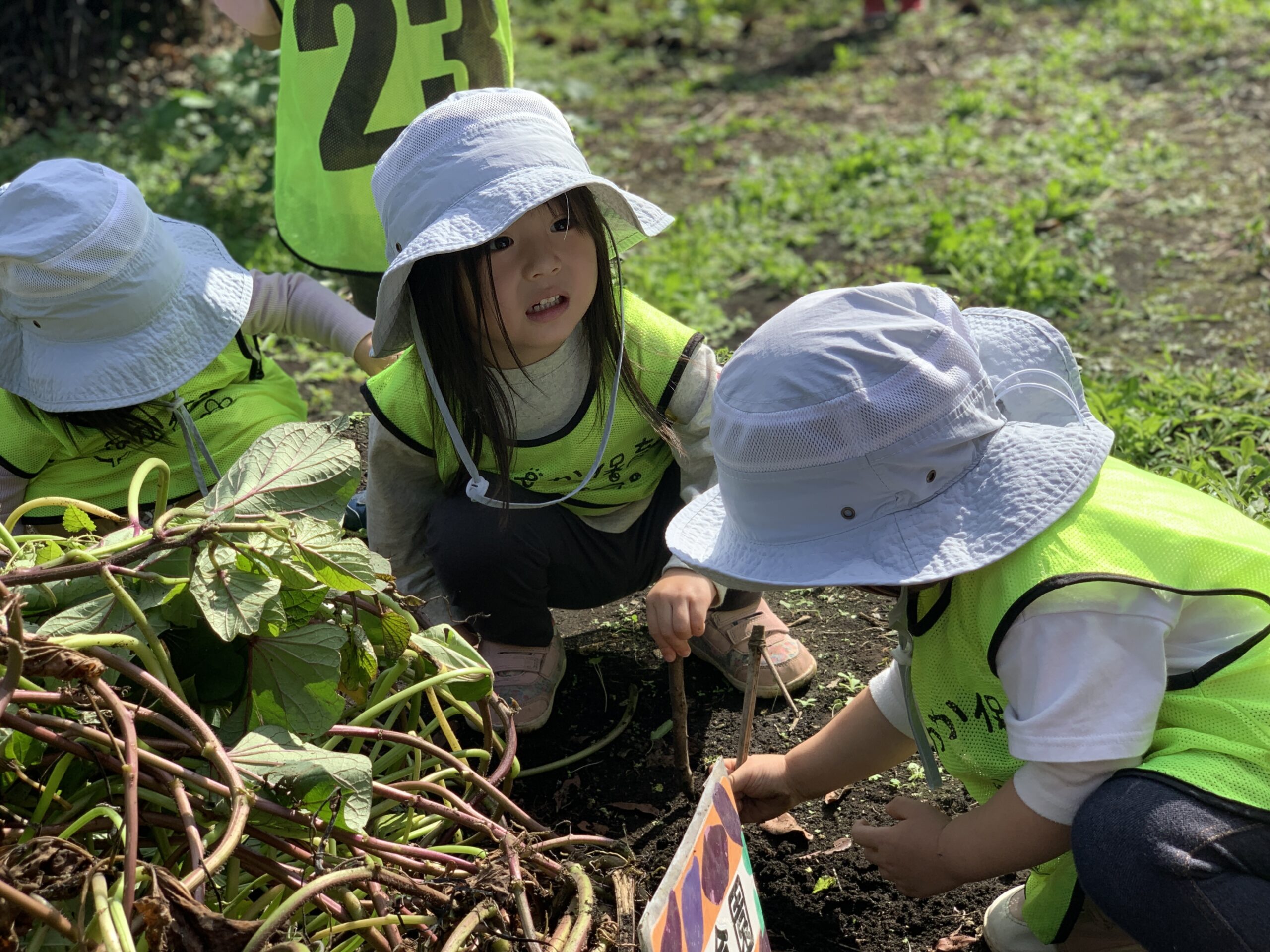 先生が「このツルの根元に、おいしいお芋さんがいるんだよ」と話すと、