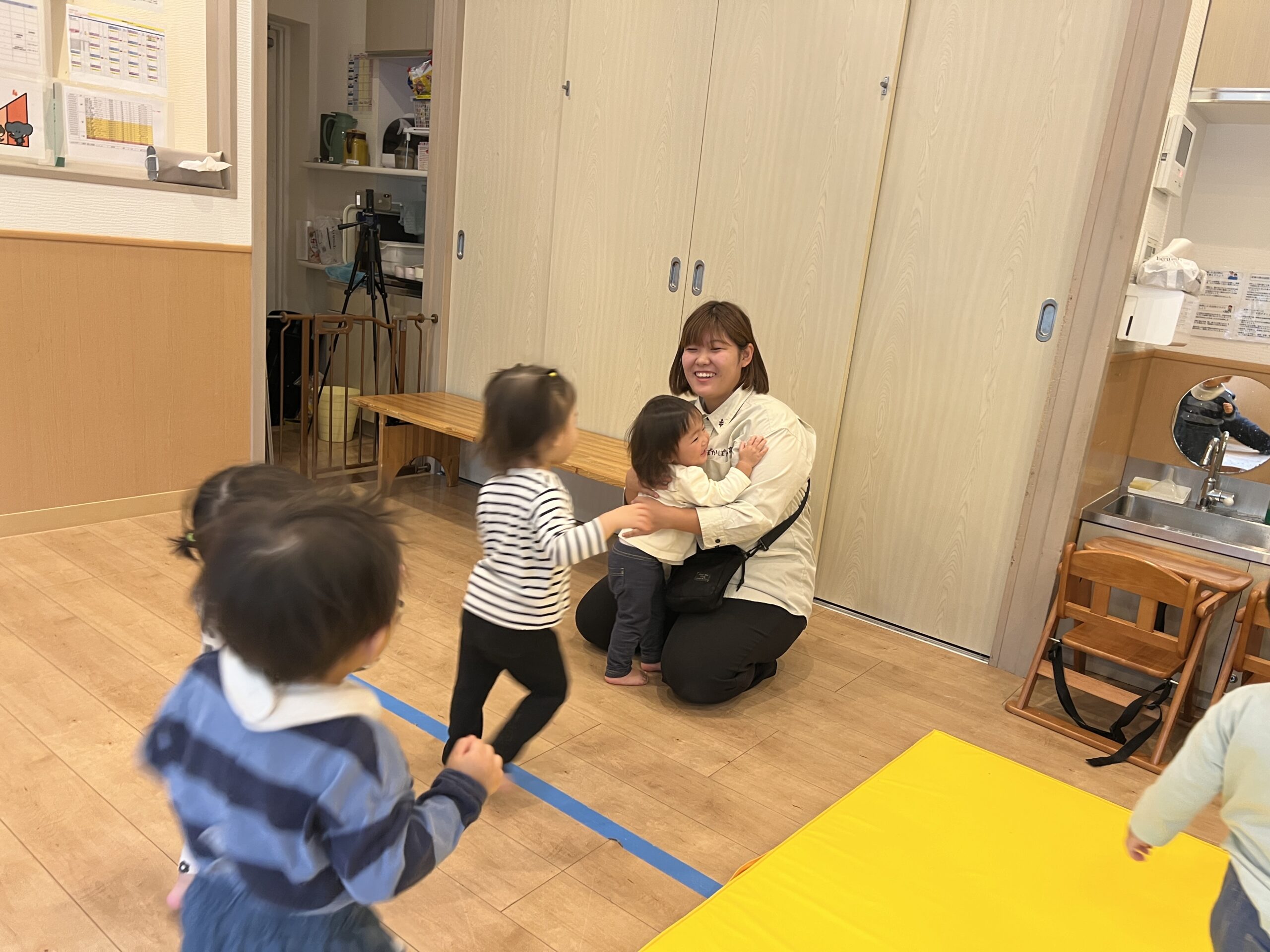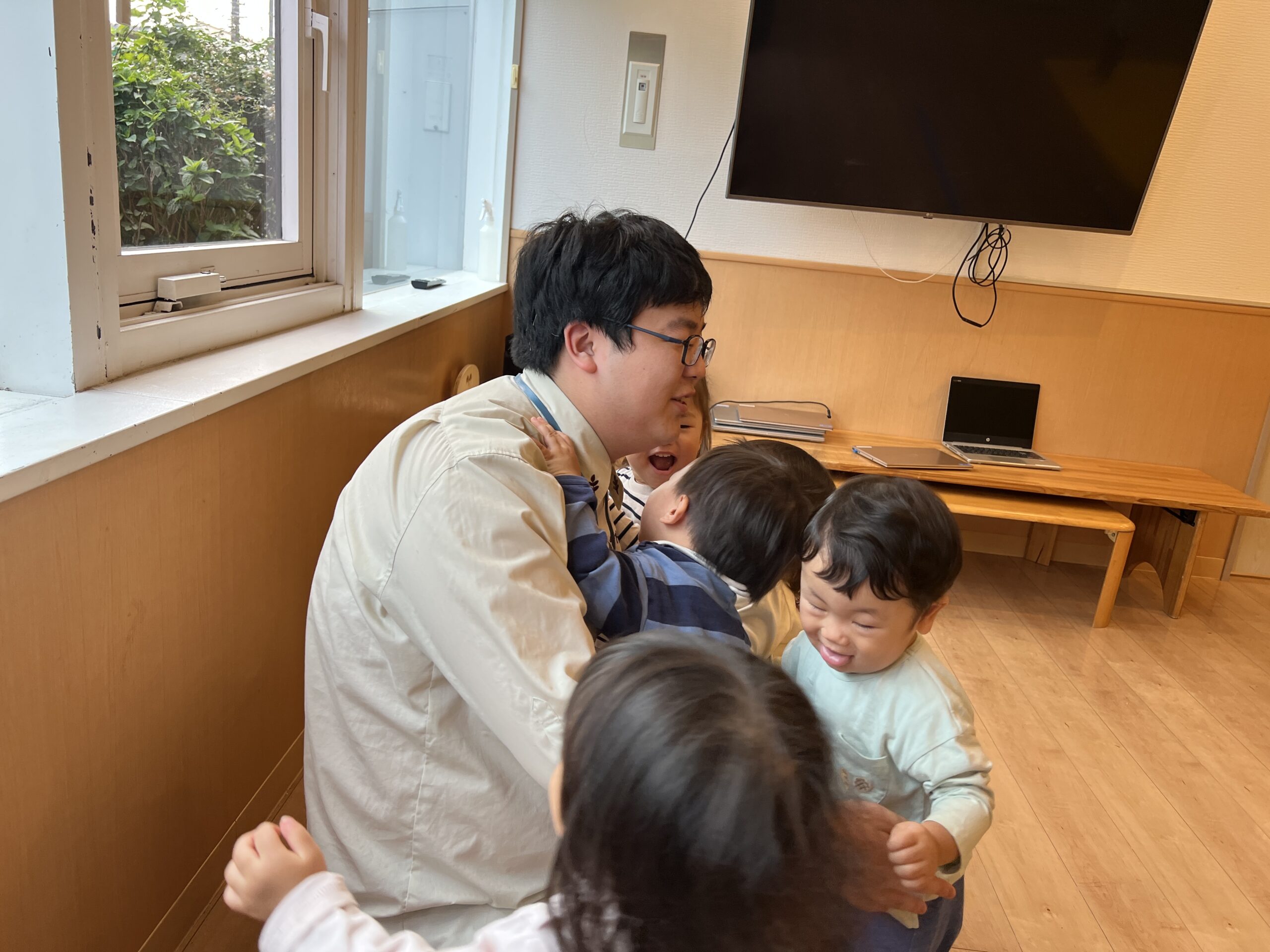 子どもたちはきょろきょろと先生を探し、見つけると駆け寄ってきてぎゅ~っとハグ。