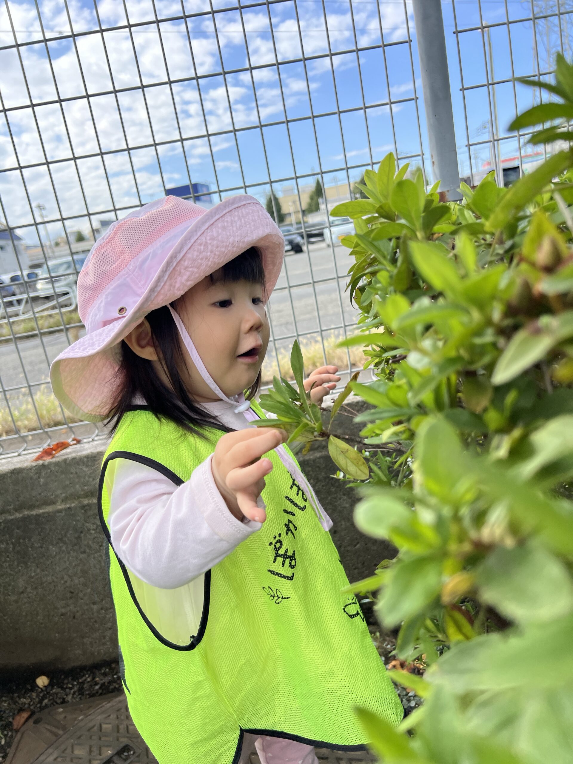 葉っぱやつるをそっと触って、「これ、つるつる!」「ふわふわ!」と、